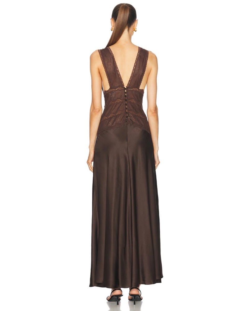 New! Stunning brown satin dress. delicate lace bodice and fluid satin skirt. True to size. Shoulder to hemline measures approx. 58".Tags: brown satin dress, chocolate dress, slip dress, wedding guest dress, festive, holiday party, brown maxi