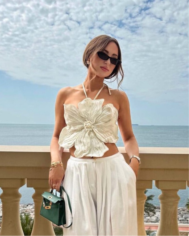 Gorgeous patbo hand beaded flower top in white. Perfect condition, only worn once. The flower “petals” are adjustable, you can expand and contract it to the size and shape that you want. So if you wish for more coverage or less, it is adjustable! Fits XXS-S (US 2) adjustable tie neck and backless
