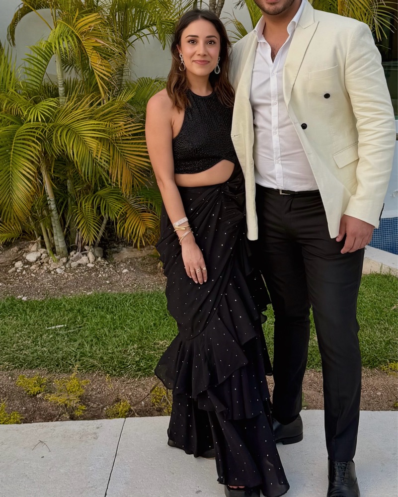 This is a pre-stitched black sari dress with ruffles paired with a black beaded crop top blouse that’s backless 😍 It’s super easy to pack and wear for a cocktail event or wedding reception
