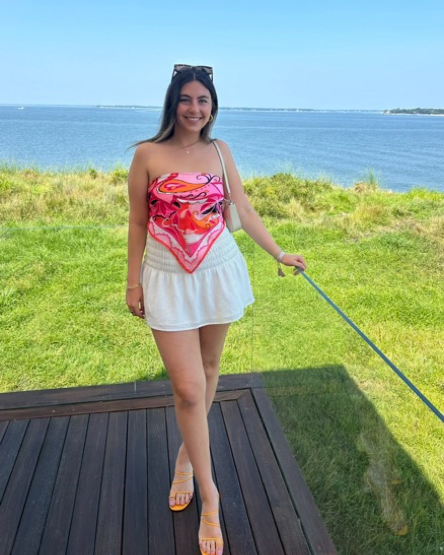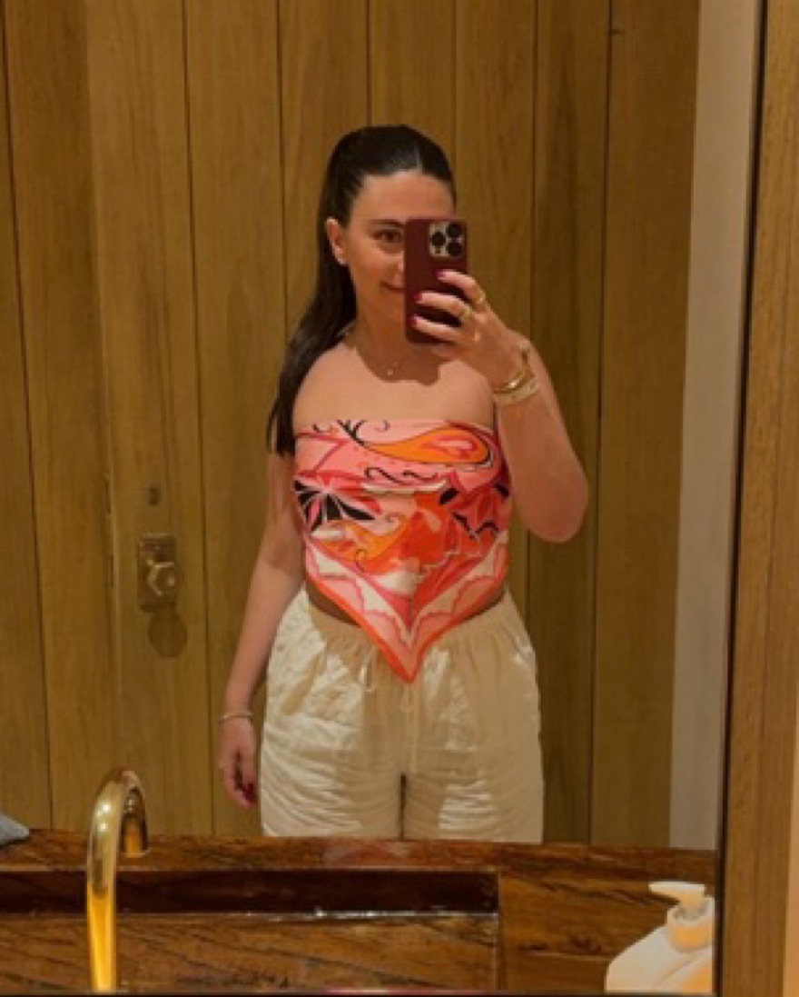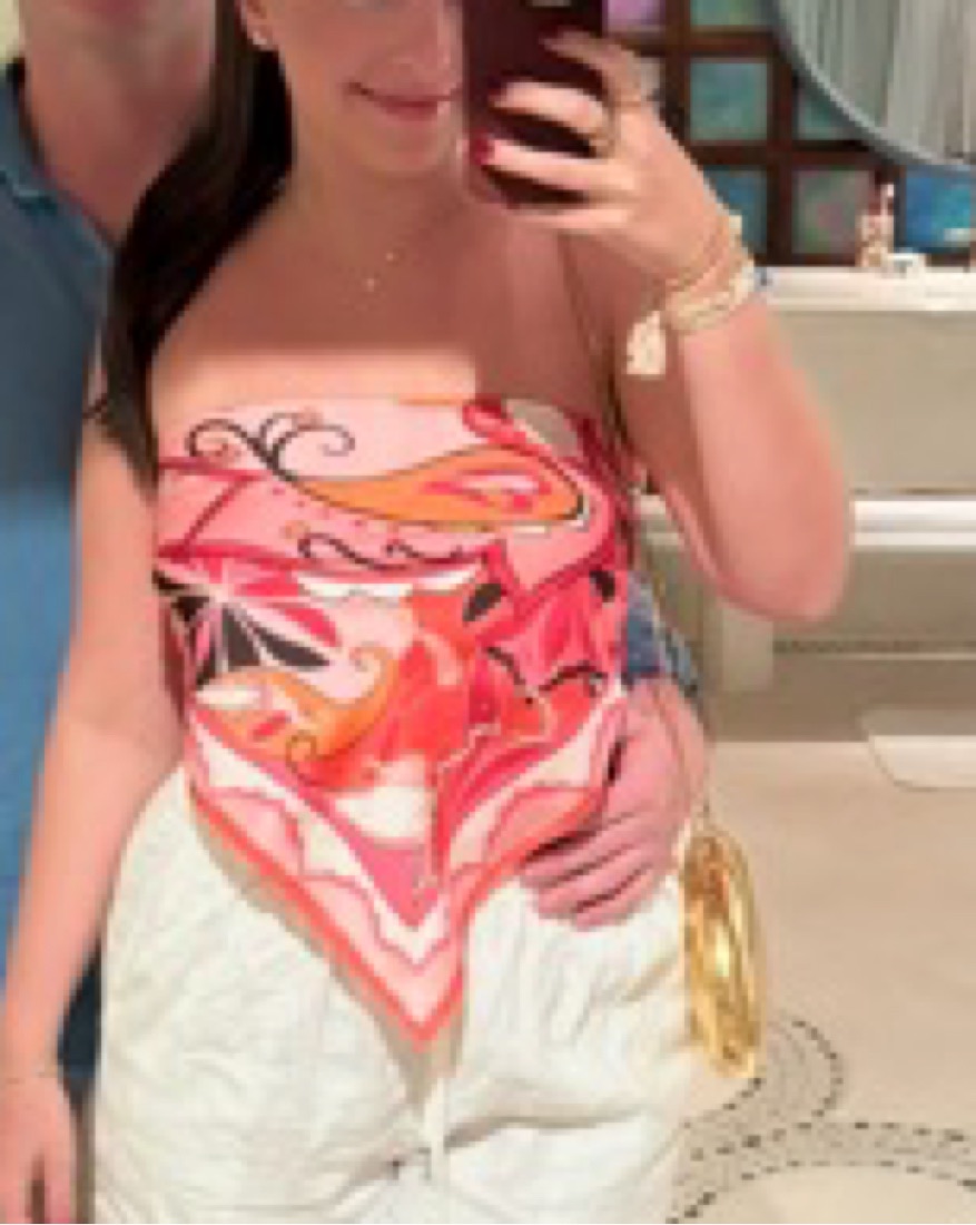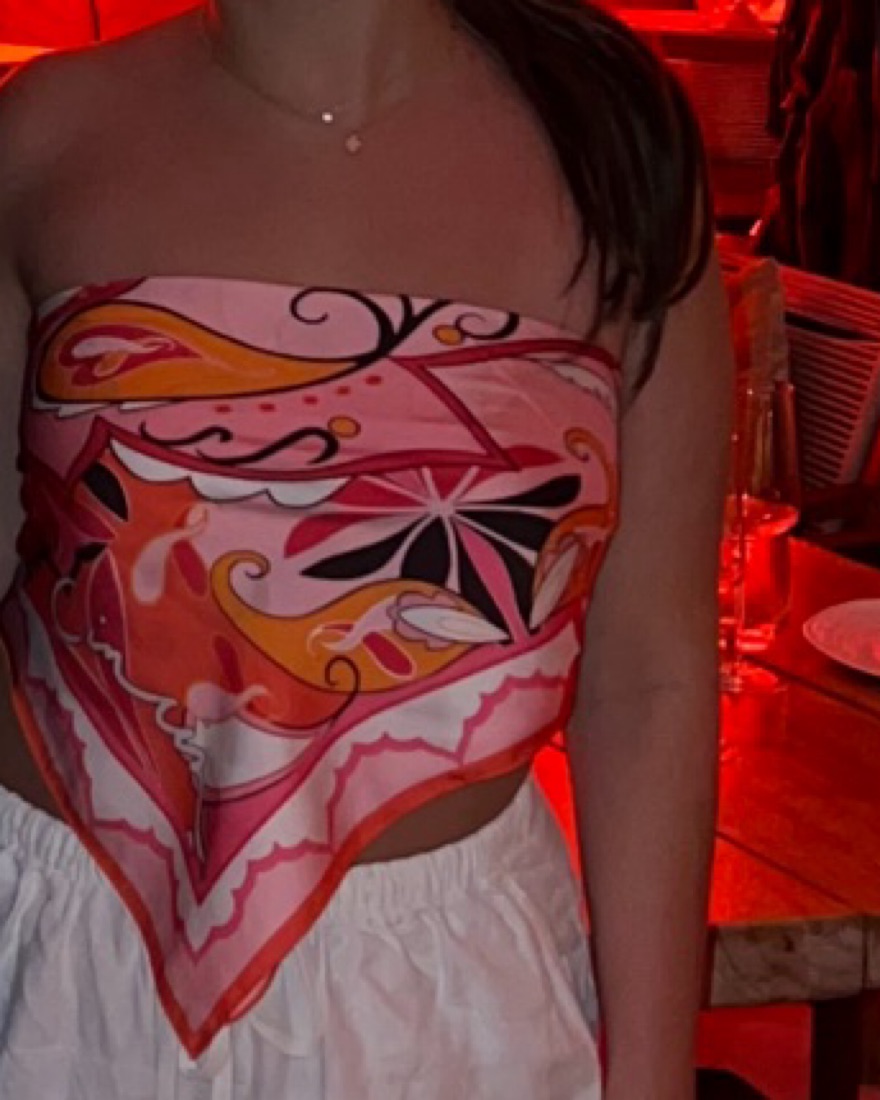 Can be worn as a top or a scarf. Shiny material and pucci vibe. Fits x small, small and medium.