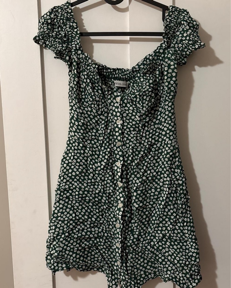 With Jean green Isabelle white floral print dress. Beautiful for summer or spring. Originally $200