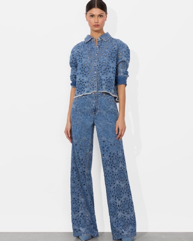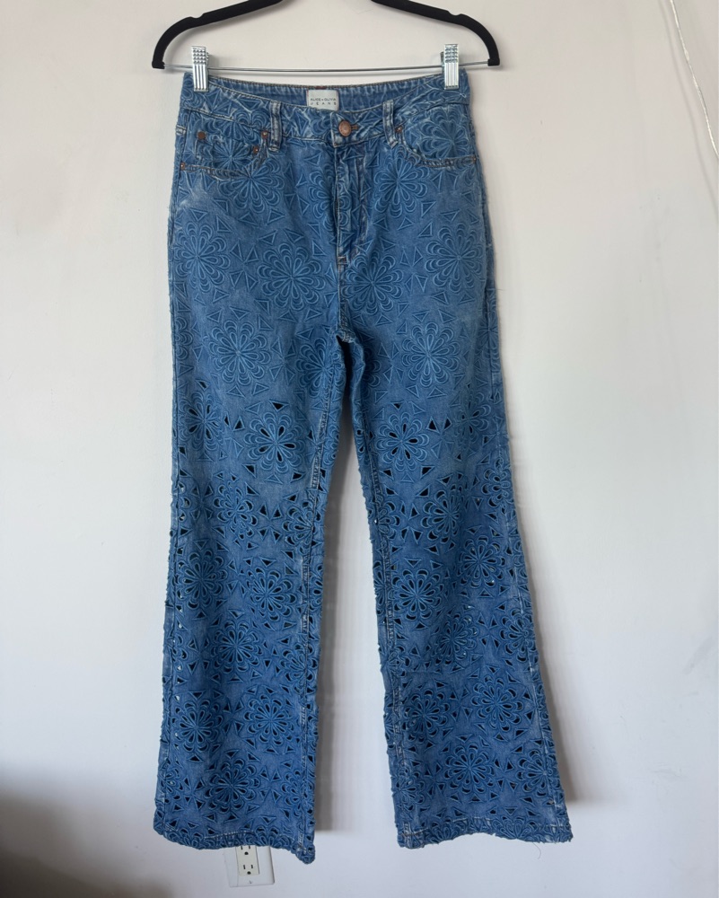 Size 27. Runs true-to-size. Our fan-favorite Weezy wide leg jean, with a twist. It’s cut from structured cotton with a flattering high-rise and full-length leg, elevated by delicate laser-cut detailing.