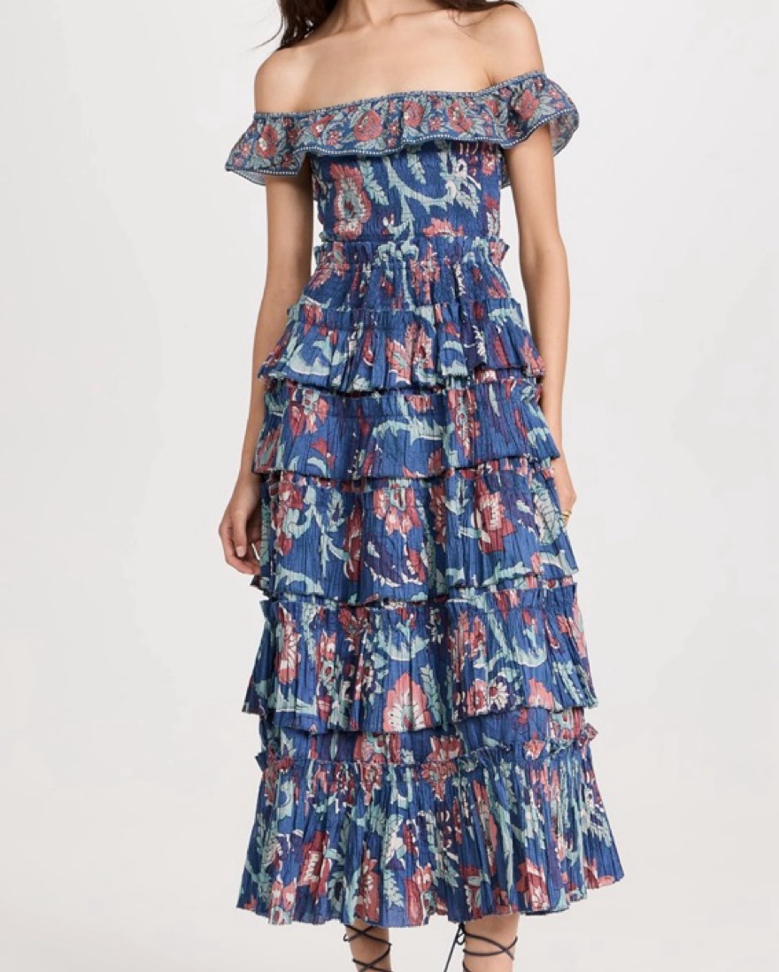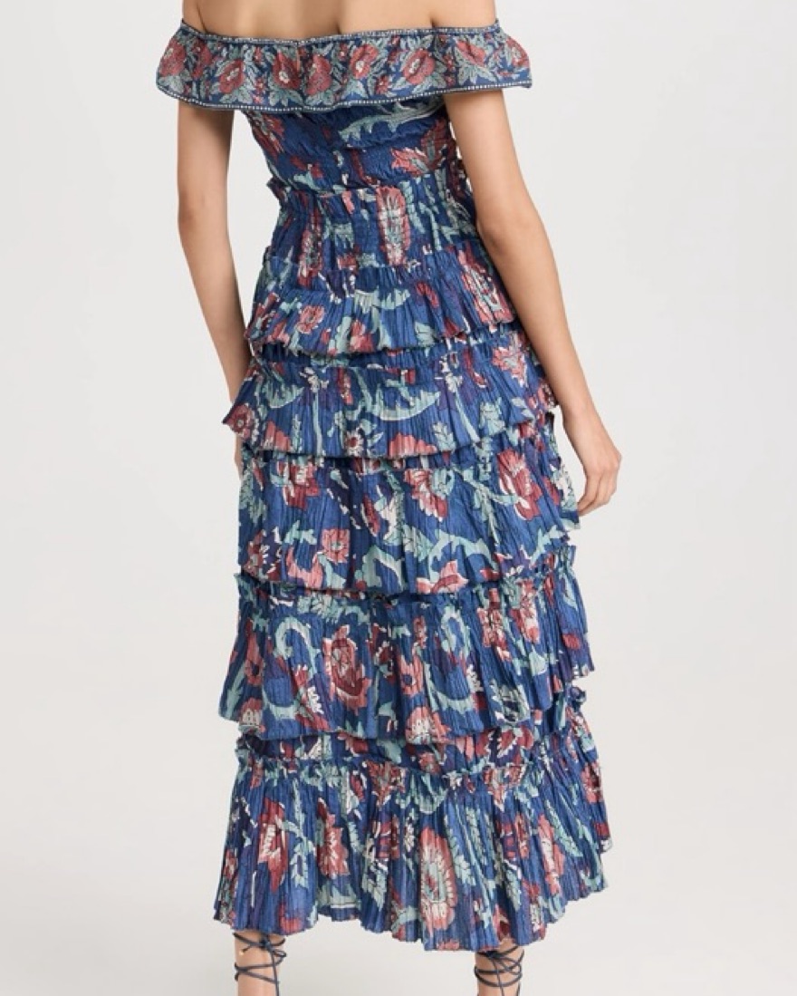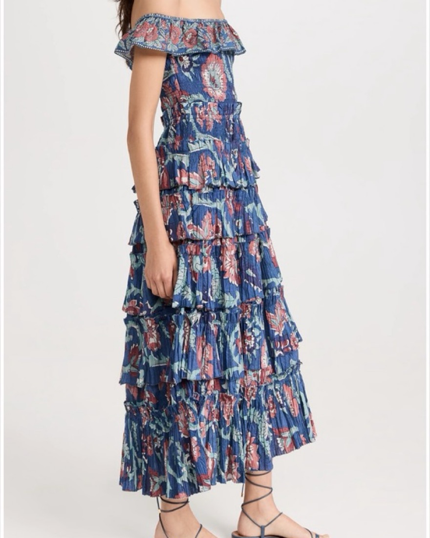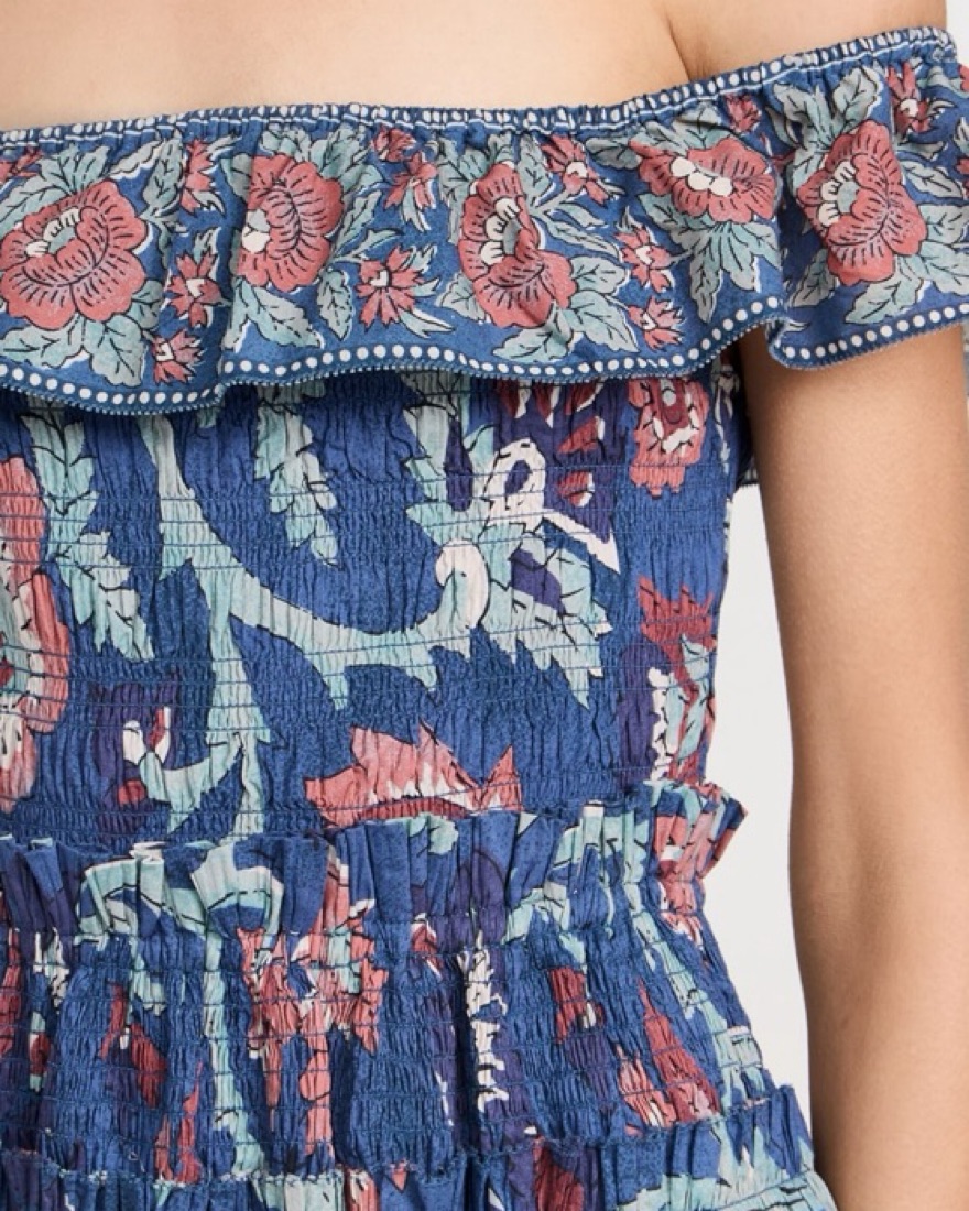 Fabric: Lightweight non-stretch plisse Elastic off-shoulder neckline Smocked elastic bodice Tiered ruffles Floral print Pullover design, no closure Shell: 100% cotton Lined Dry clean Imported, India