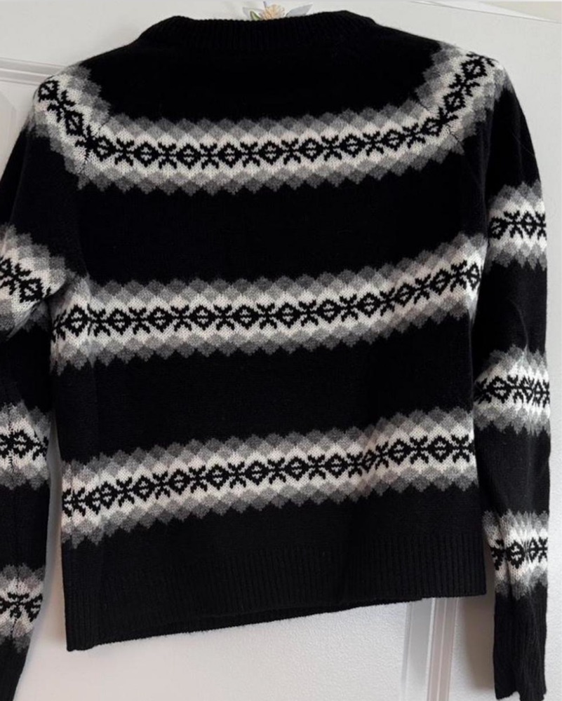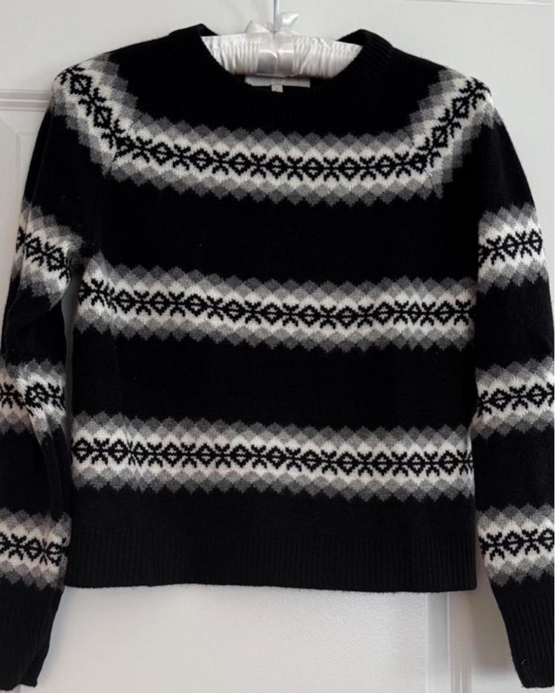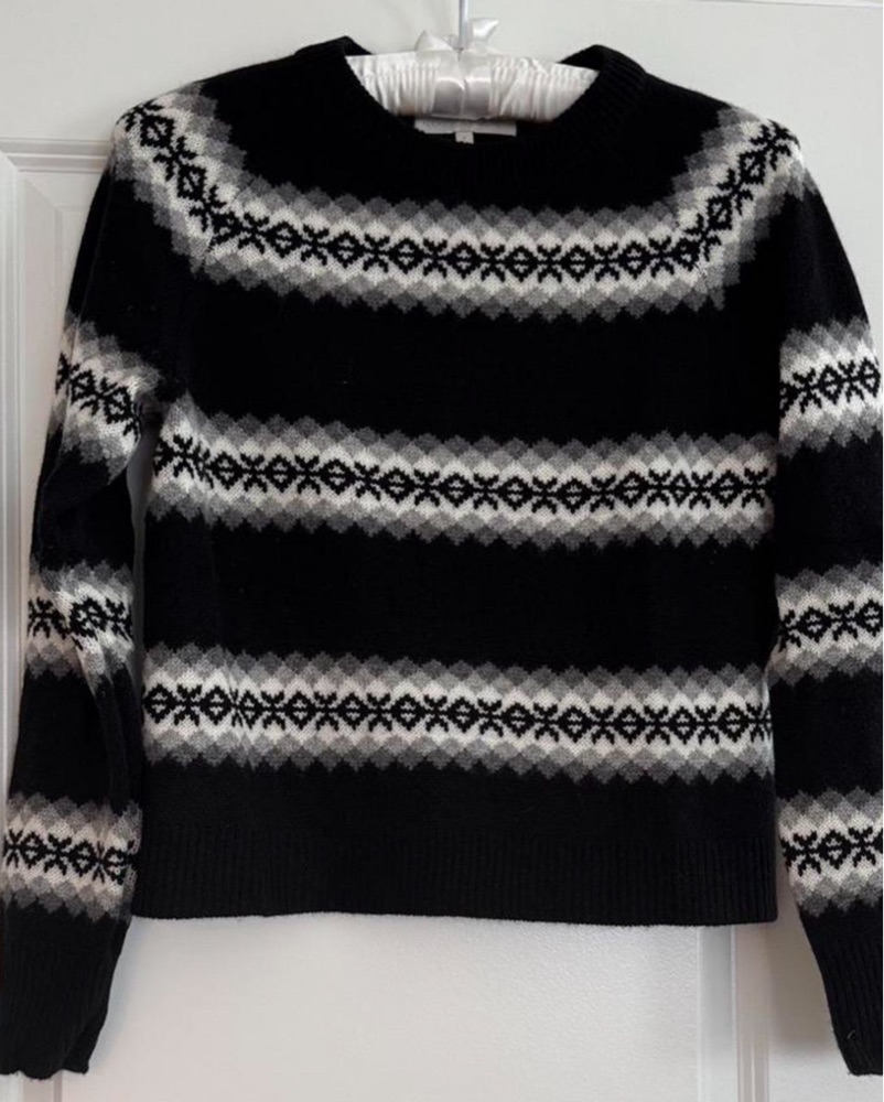 This stylish geometric patterned sweater is a versatile piece that can be dressed up or down. Perfect for a casual weekend or a night out. 100% cashmere, super soft and warm!