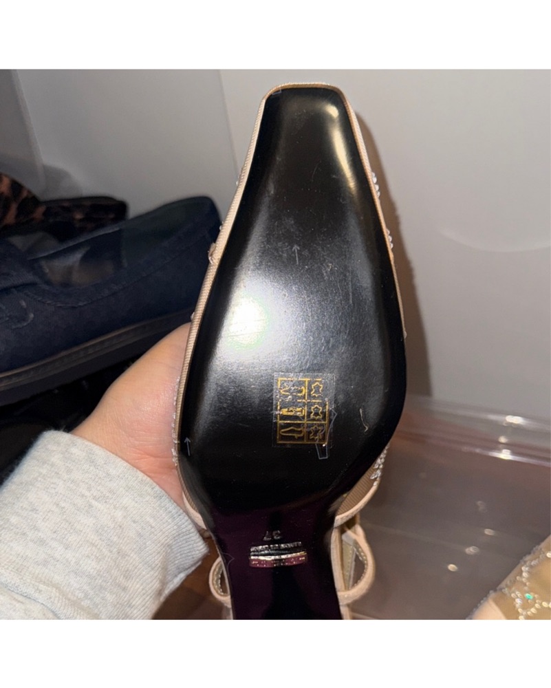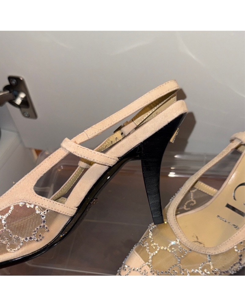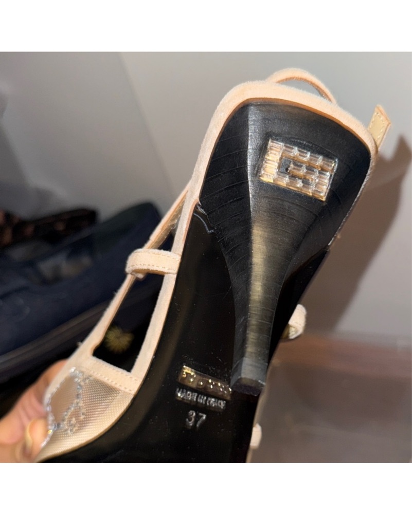 Dupe slingback heels featuring a beige base with silver mesh overlay for a touch of sparkle. Elegant pointed-toe design with slim straps makes them perfect for dressing up any outfit.