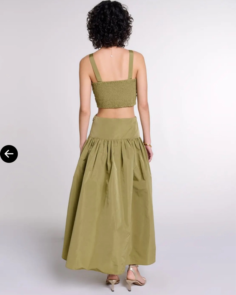 Made from taffeta-style fabric, this long dress has a plunging V-neckline with a ruched effect, set off by wide straps. Wear it day or night- I especially love the airy, full skirt and cutout back.
