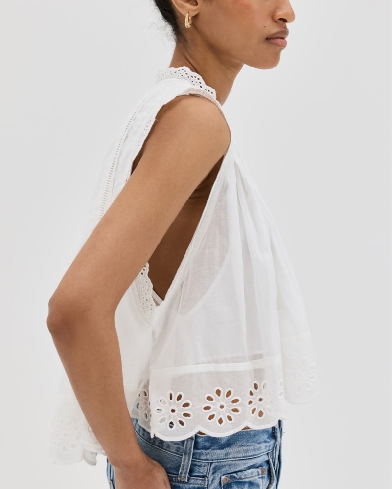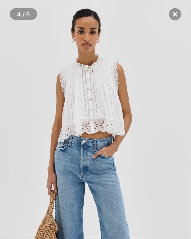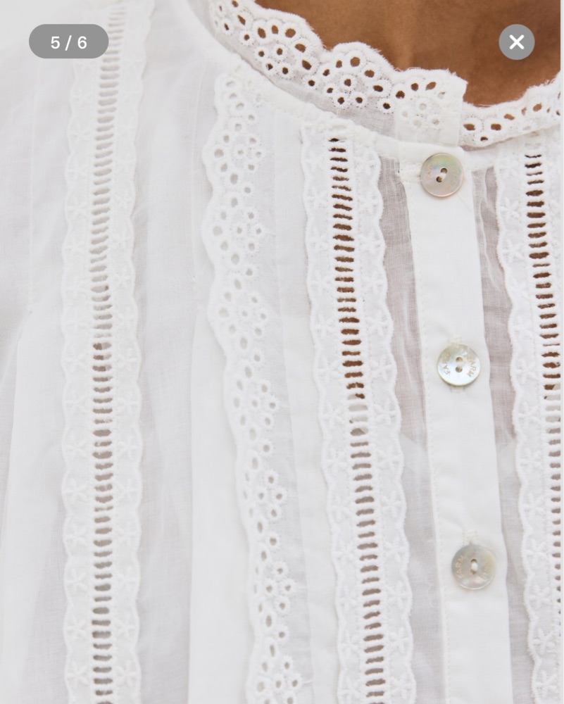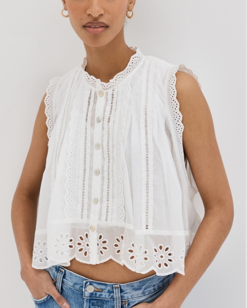 Fabric: Lightweight, non-stretch plain weave Embroidered eyelets and ladder-stitch trim Scalloped edges Button placket Shell: 100% cotton Lined