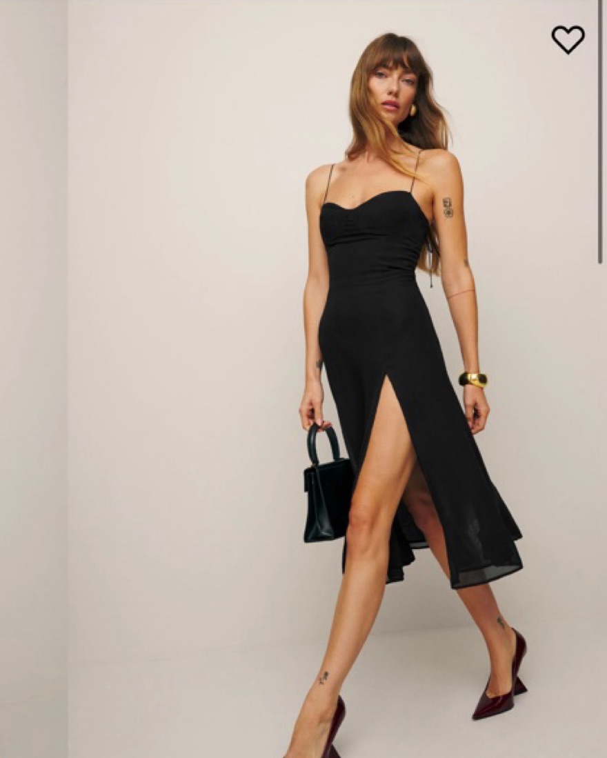 This stunning black dress with a thigh-high slit is perfect for a night out on the town. The fitted silhouette and sleek design create a sophisticated and alluring look.
