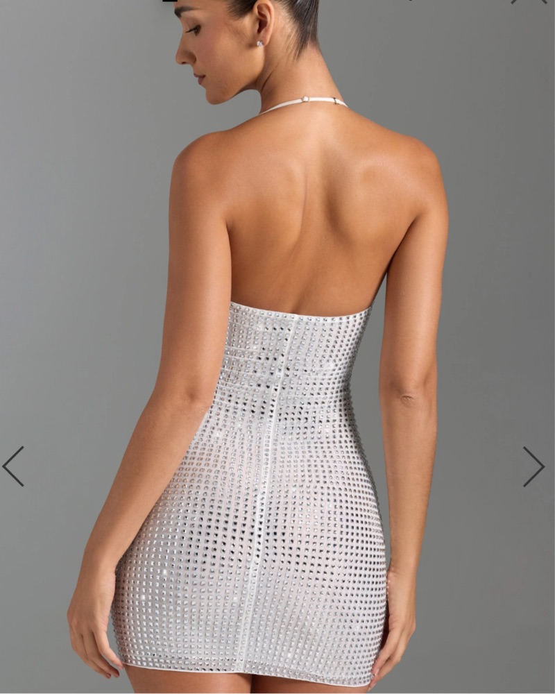 Classic silhouettes with a sparkling twist. Perfect for your next evening event, the Amolika mini dress is adorned with scores of signature HOTFIX embellishments that sparkle endlessly under spotlights. Only worn once for a concert!