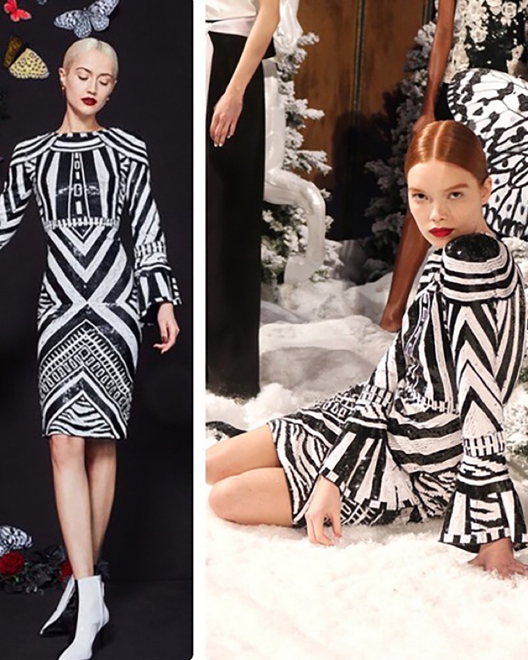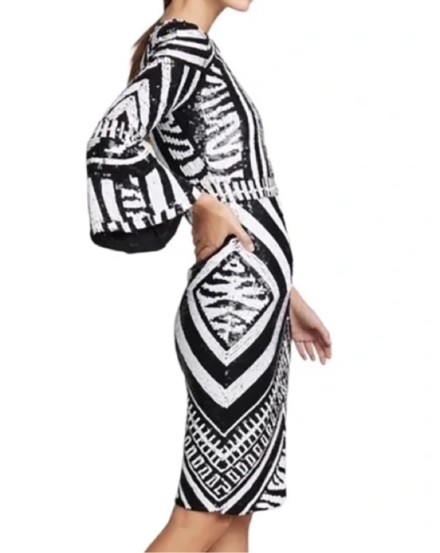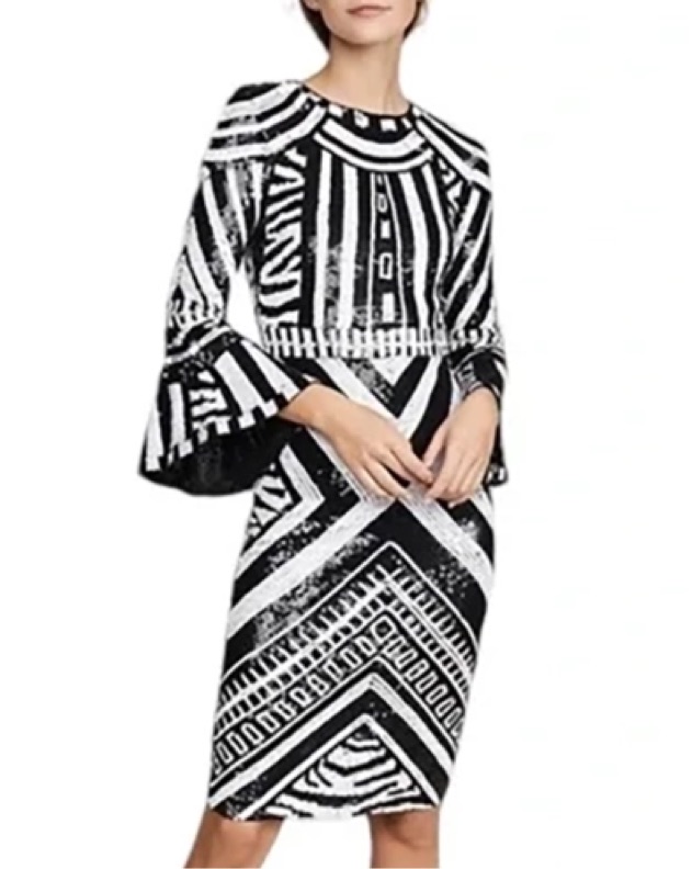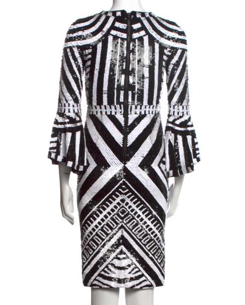 Brand new with tags glamorous Alice + Olivia Jae knee-length dress. This fitted dress features all-over, light-catching sequins in striking geometric patterns, 3/4-length sleeves with dramatic bell cuffs, and a slight stretch for comfort.