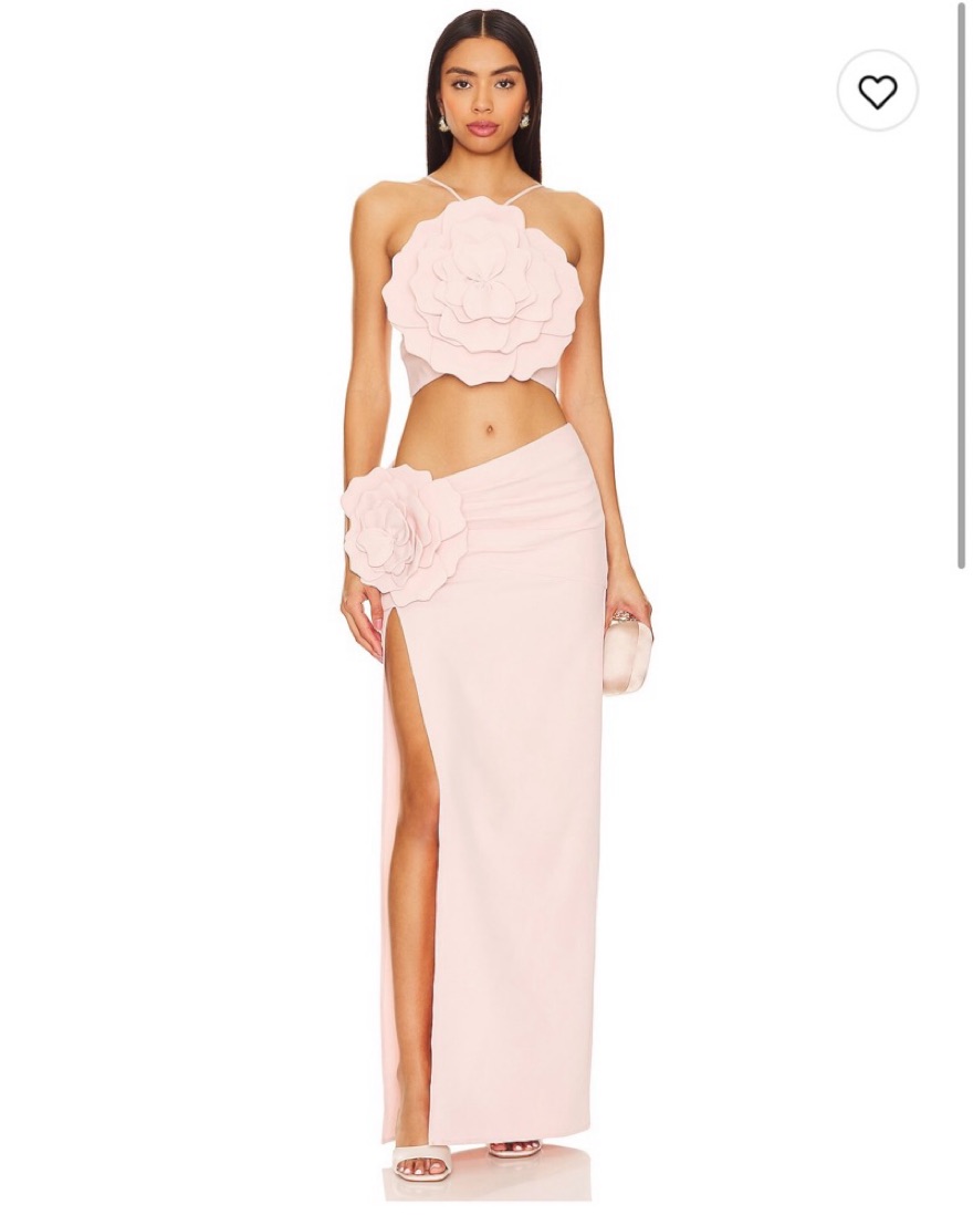 Light pink floor length gown with floral appliques, leg slit, and cut outs
