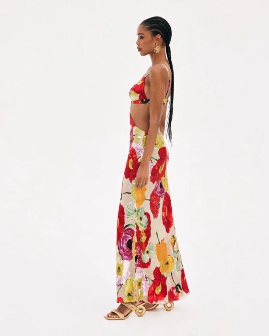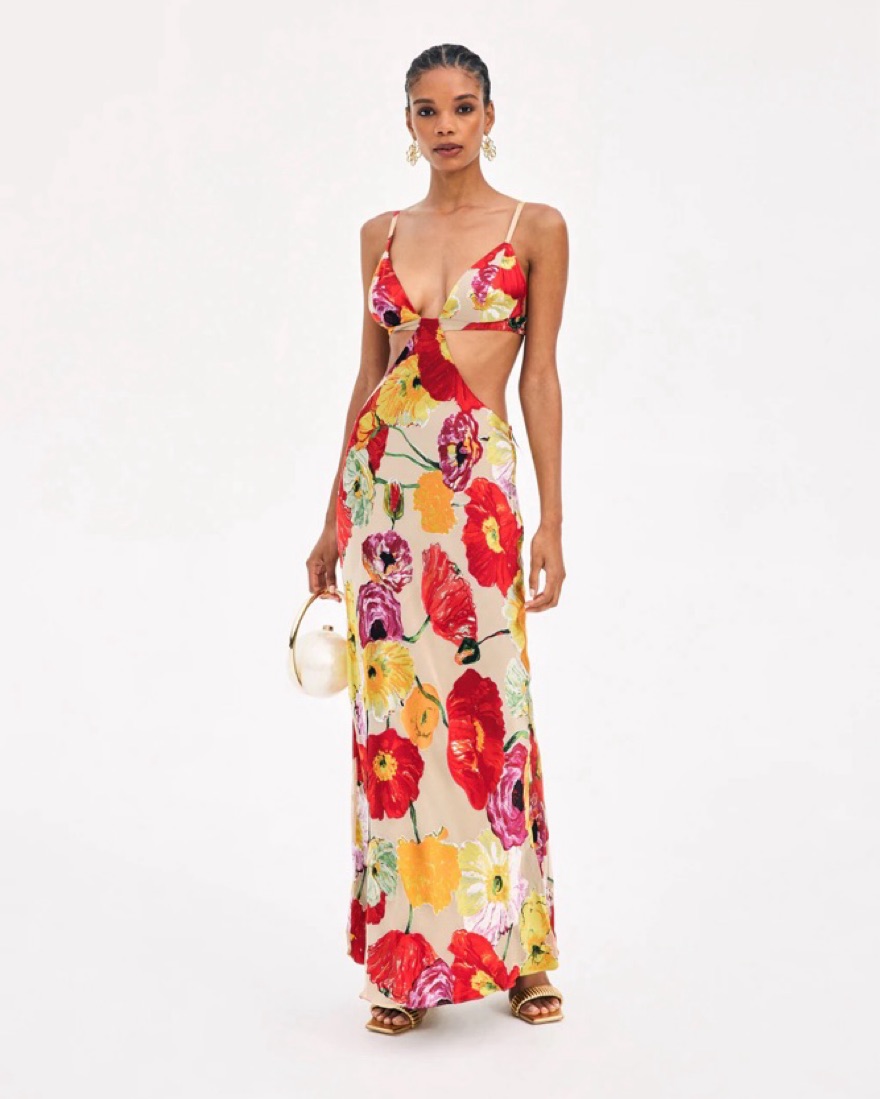 Floor length silk maxi dress with cutouts exposing back and torso. Hints of yellow, red and gold floral designs throughout the dress inspired by a painting. Perfect dress for a summer getaway, romantic dinner or wedding guest.