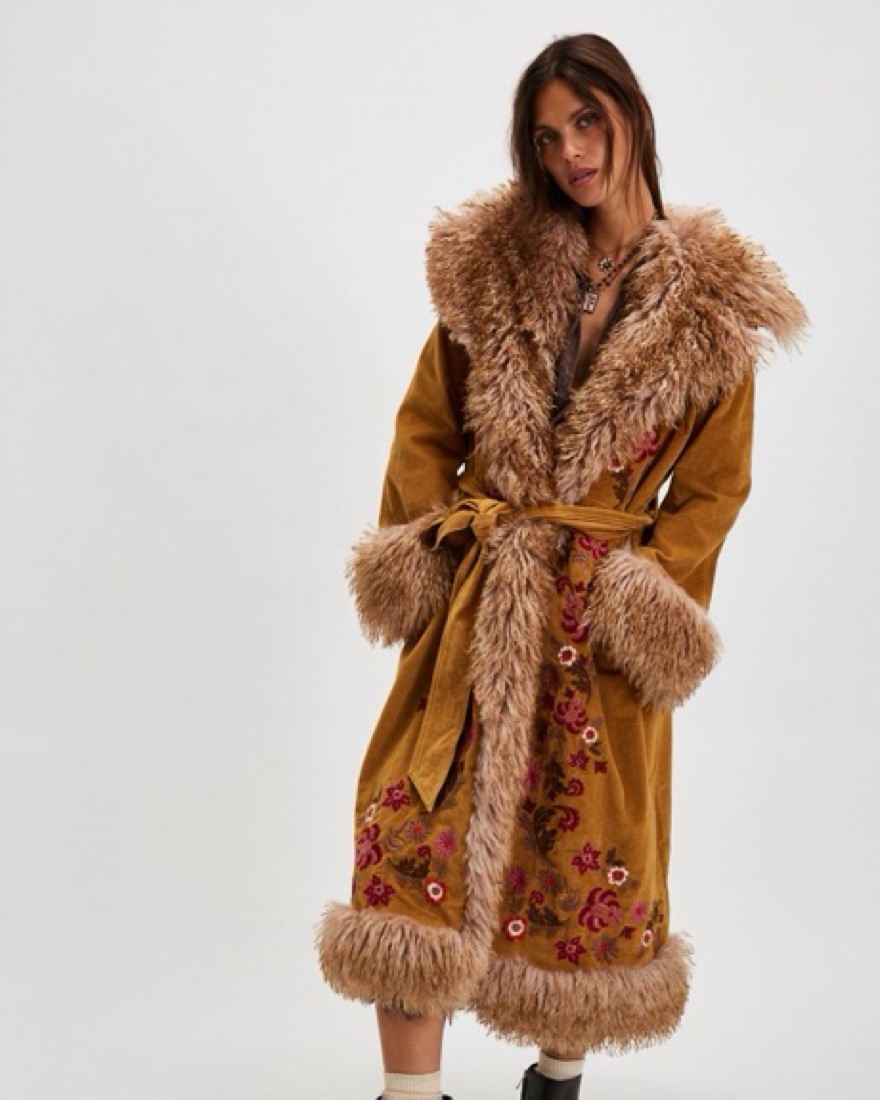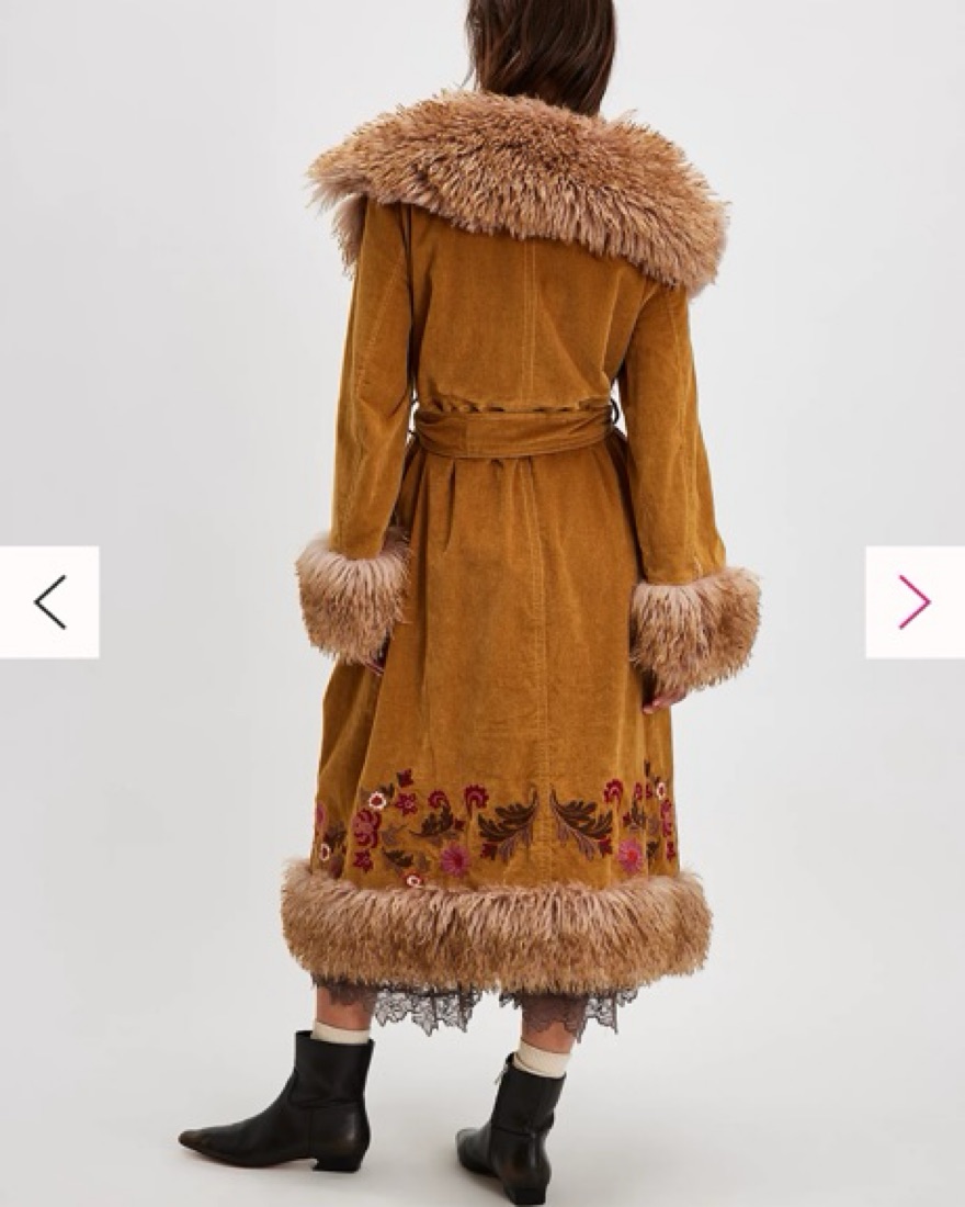 The only coat you’ll ever need, featuring a cool corduroy fabrication and longline silhouette with fun floral embroidery and exaggerated faux fur trim.