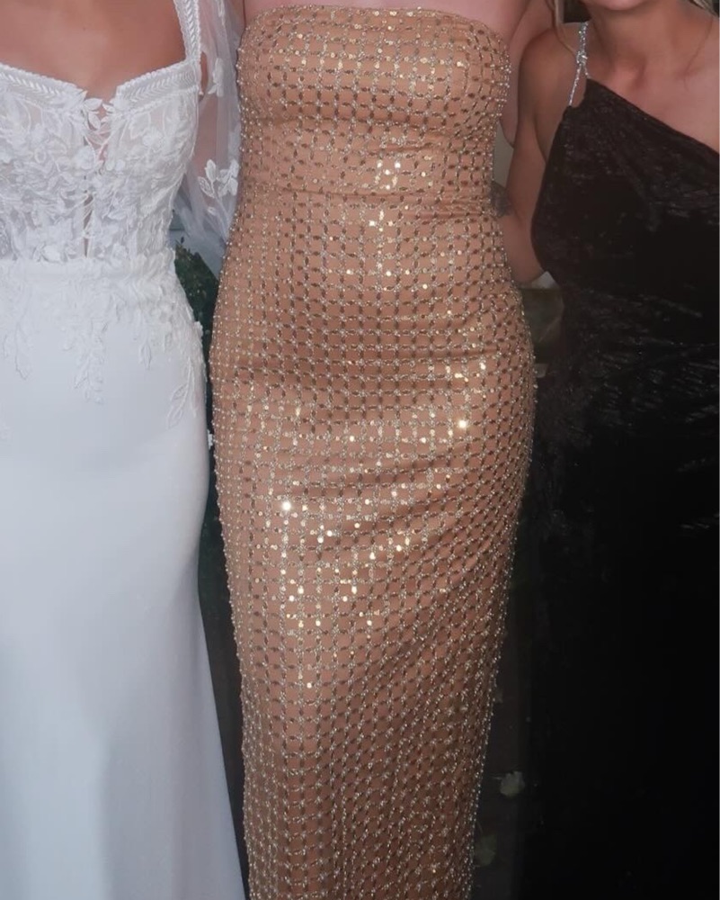 This dazzling gold sequin gown is perfect for a glamorous night out. The form-fitting silhouette and high slit add a touch of drama and sophistication. Renter is responsible for cleaning if necessary. (Wedding guest, formal, black tie)
