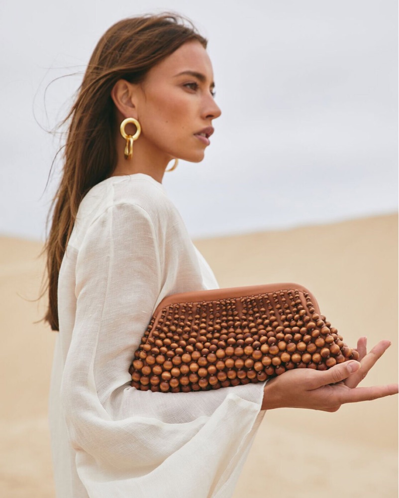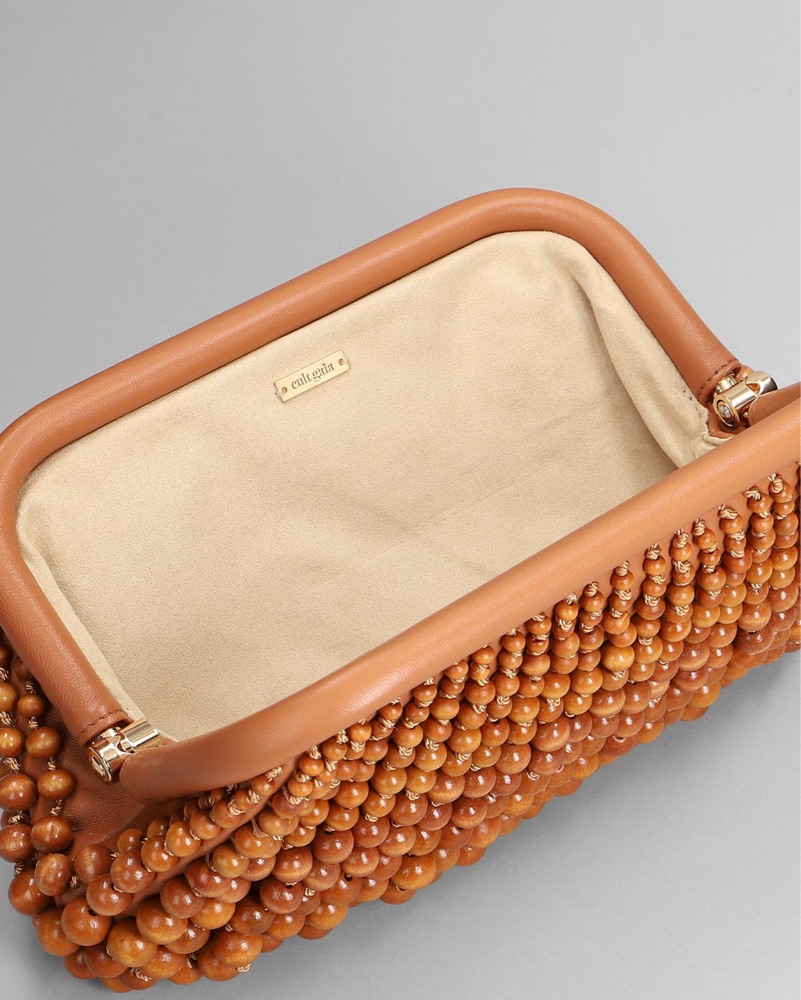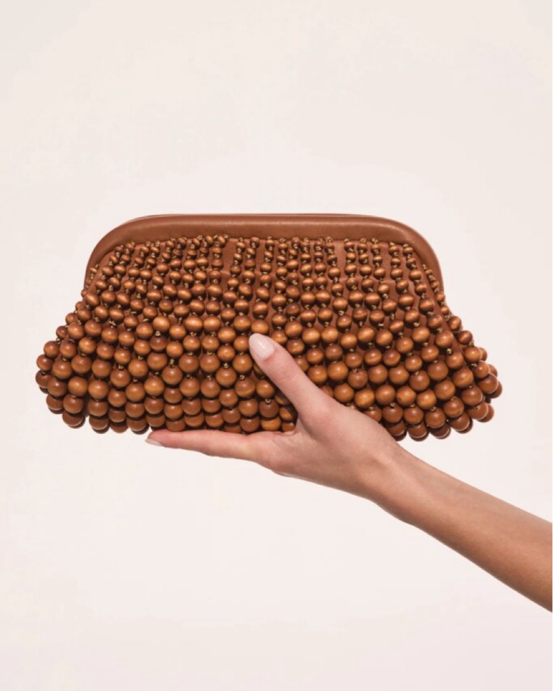 Chic box clutch cast in leather with allover wood bead embellishment. Frame top with magnetic closure Wood beads on leather