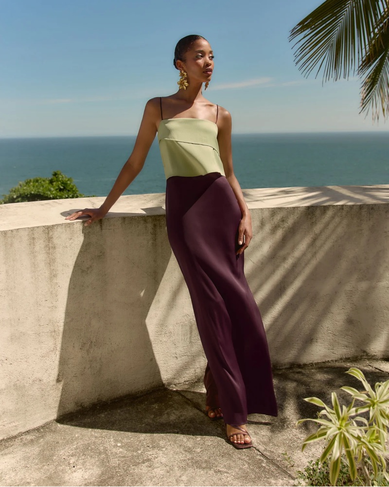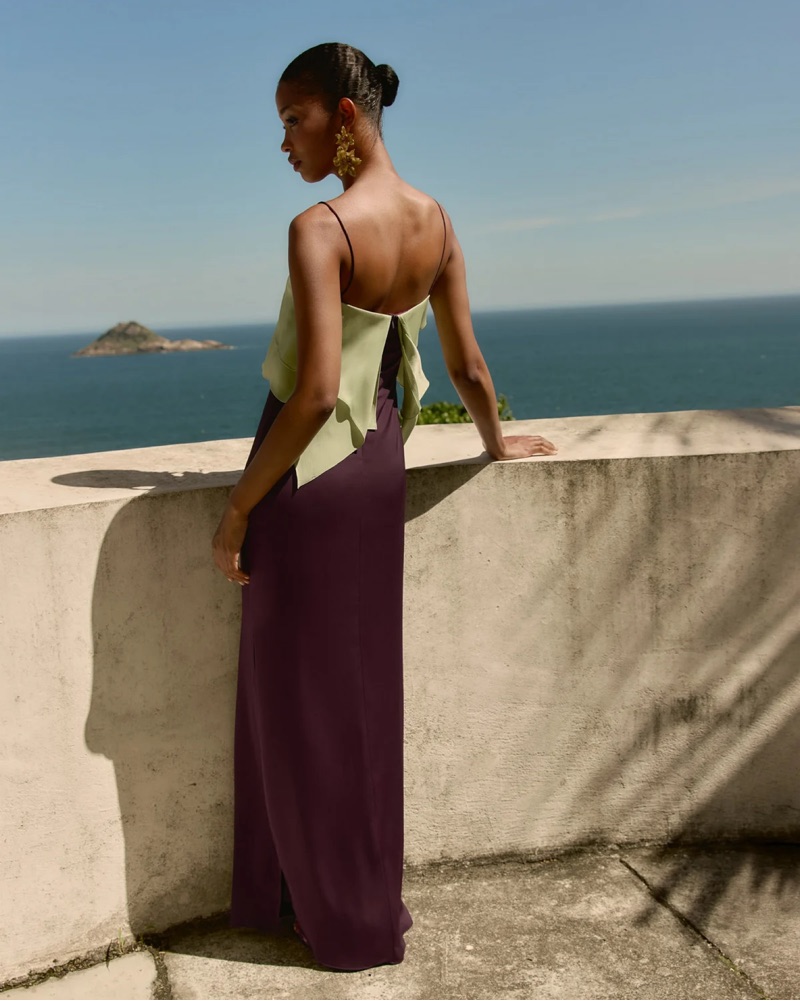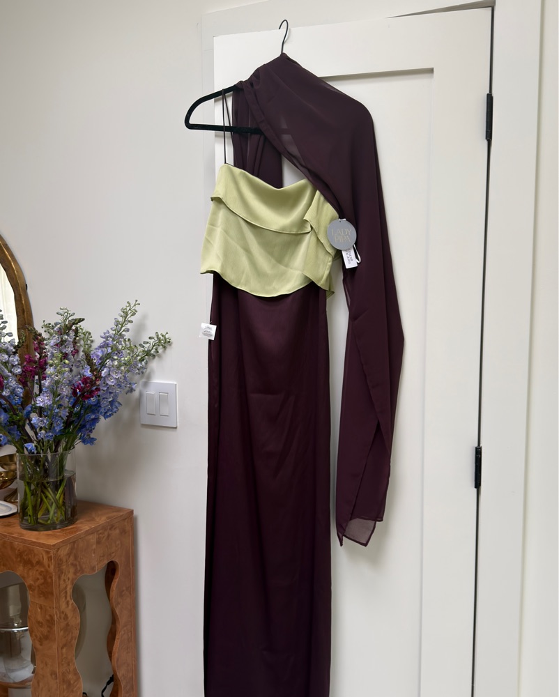 Cherry red and green long dress. chiffon overlay top. Straight neckline and fitted skirt with side slit. Comes with Tosca Cherry Red Shawl from Lady Pipa too!