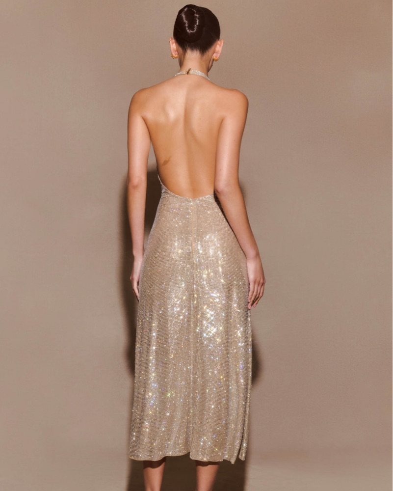 Meshki Genie Diamante Halter Midi Dress in Nude, size Small, SOLD OUT, sparkly / glittery / sequins, perfect condition!