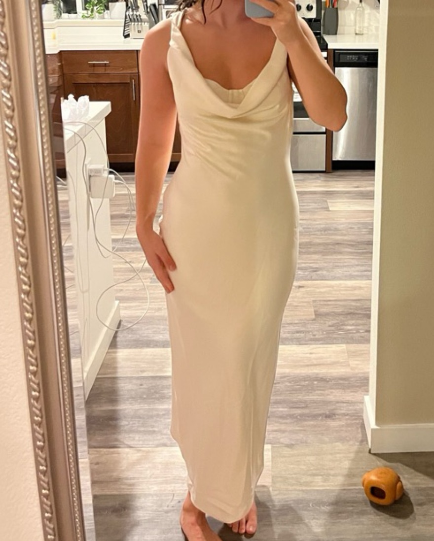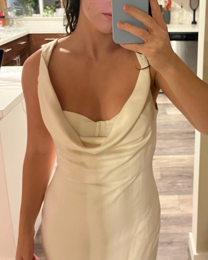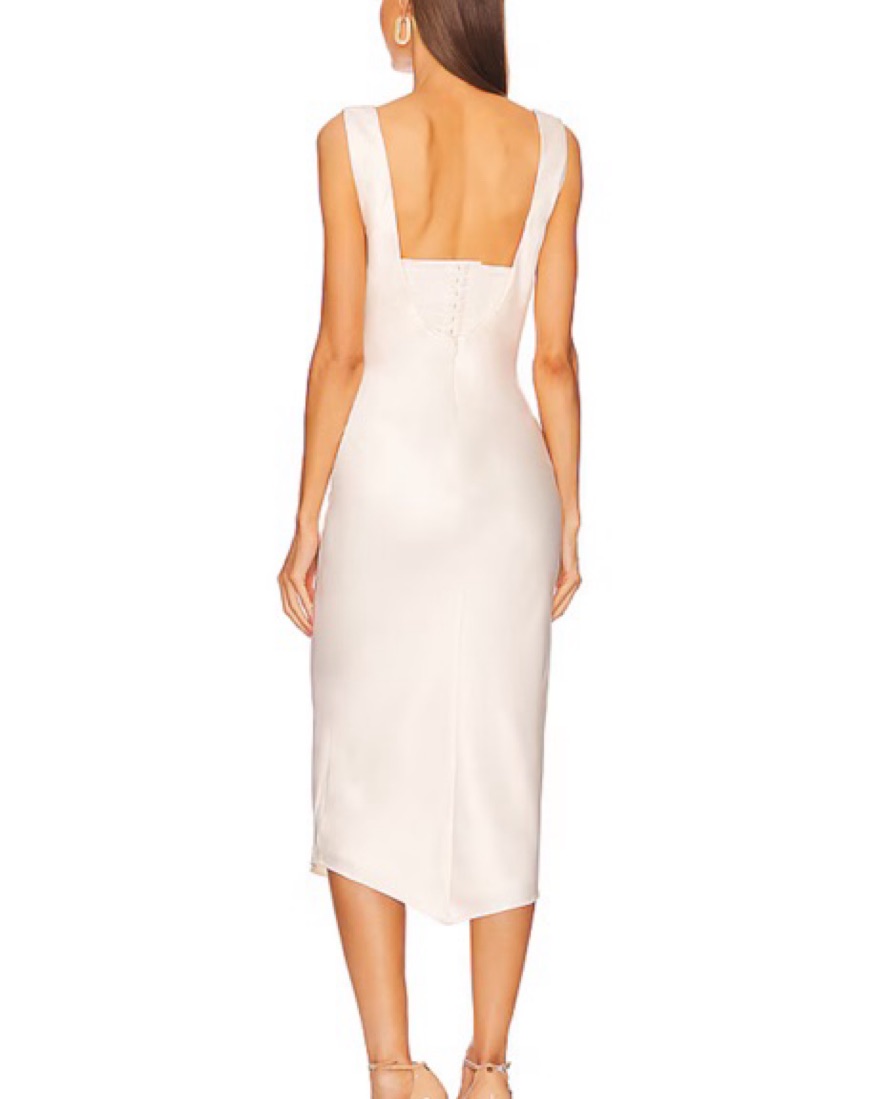 Ivroy midi dress, draped neckline with removable bustier. Double lined Hidden back zipper closure Sheen satin fabric