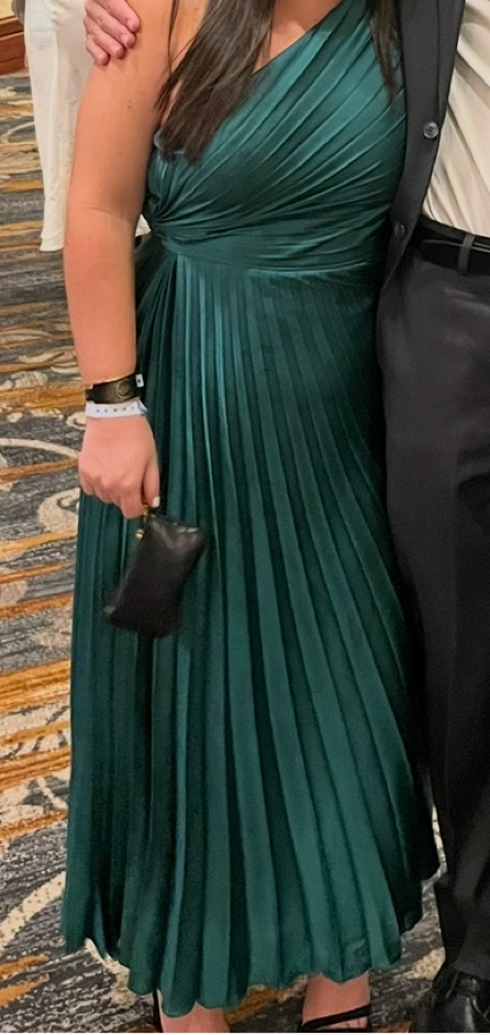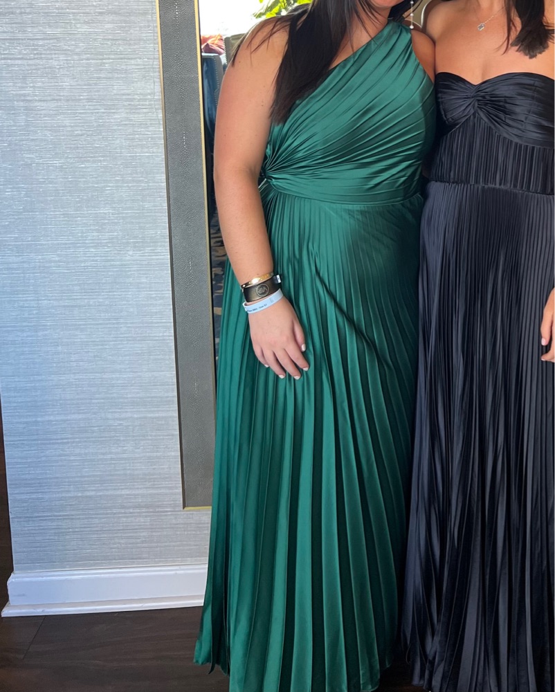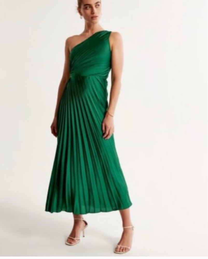 Green satin one shoulder pleated maxi dress. Is a PETITE size! I’m 5’1 and it didn’t need to be hemmed.