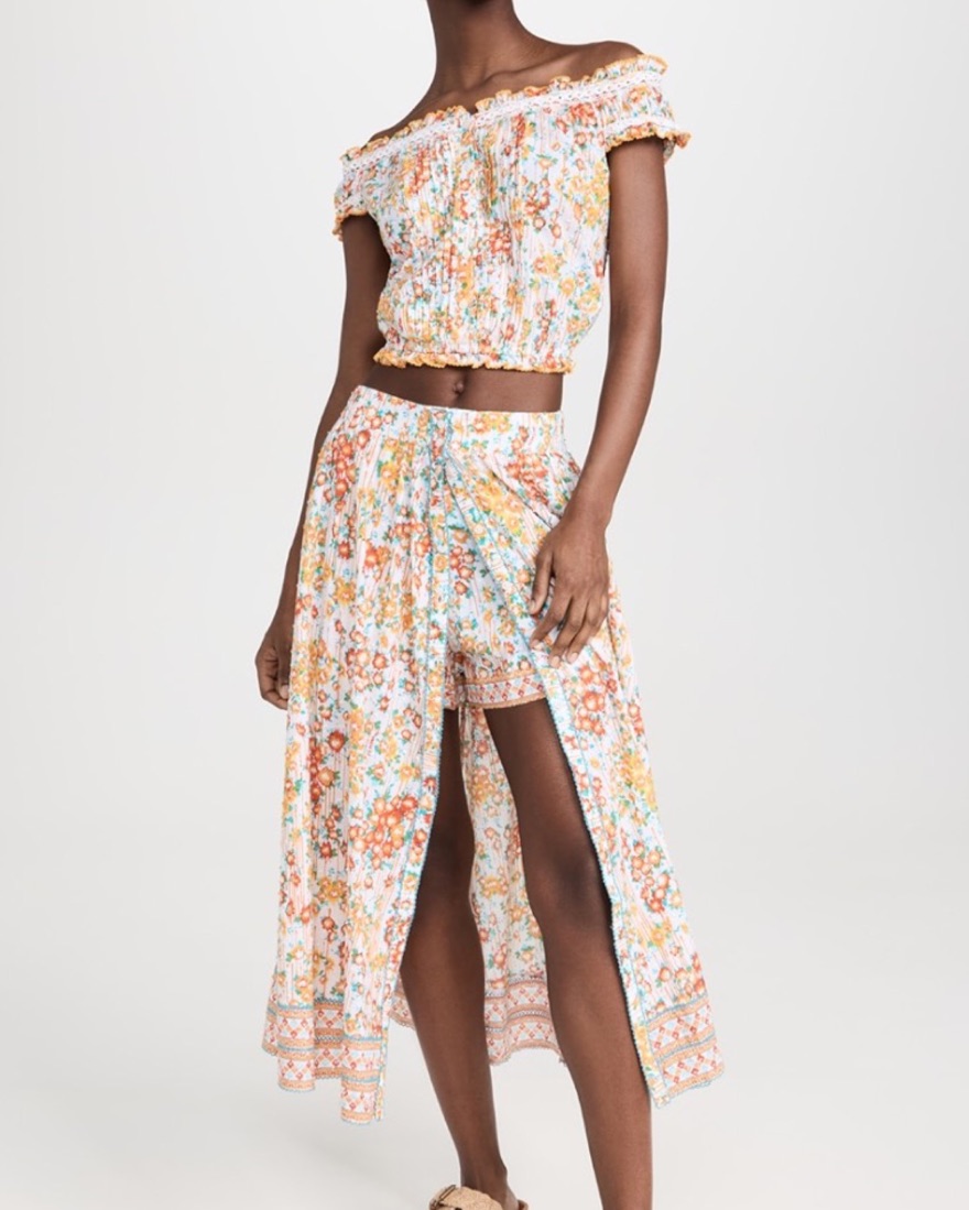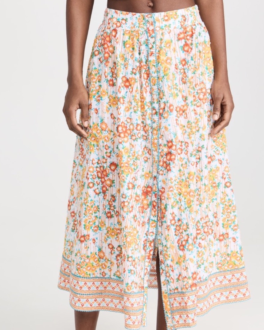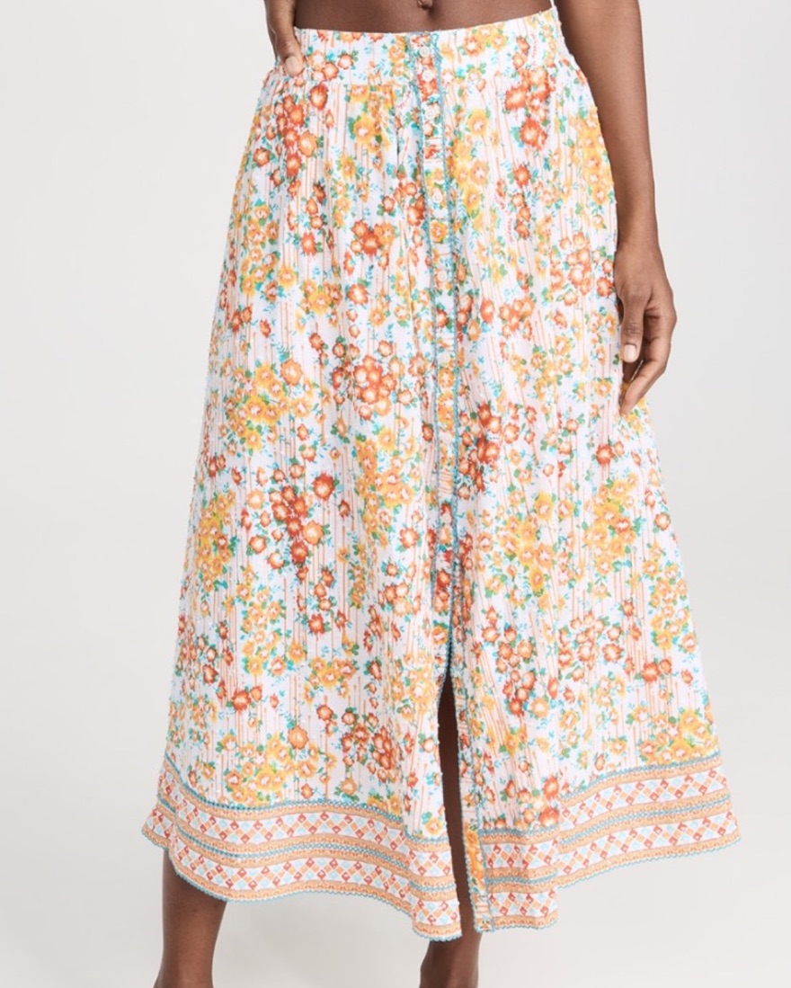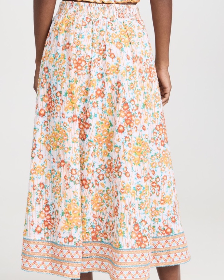 Poupette st Barth midi skirt reine in orange aquarelle. Floral print and flocked Swiss dots, smocked elastic waistband and hidden zip in back, technically can be skirt. Can be worn with buttons open to show shorts or buttoned as skirt