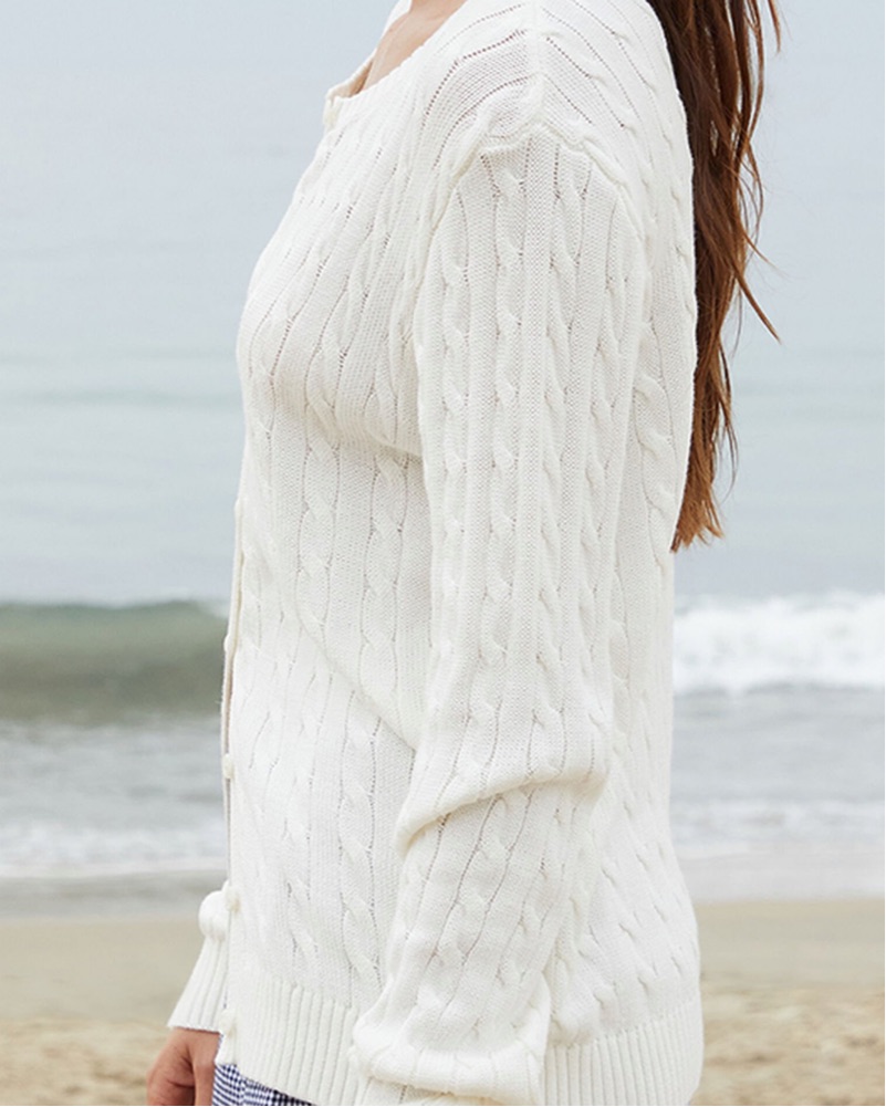 This soft and textured cable knit cardigan is perfect for a day spent strolling along the beach. Pair it with your favorite denim and sneakers for a chic, casual look.