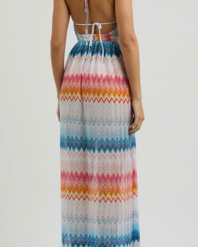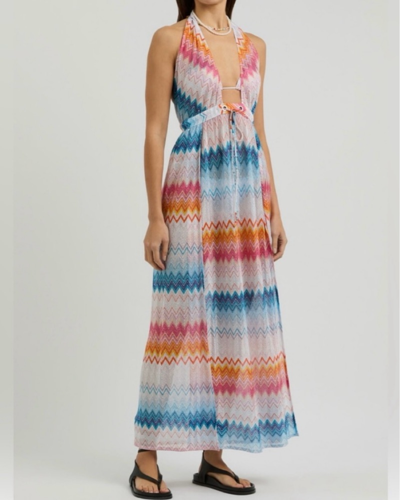 Brand New Missoni Zig Zag Lame Cover up dress. Size IT 40. I am a size 4 for reference, only worn once. Embrace vibrant style with this colorful zigzag patterned swim cover-up. Perfect for beach days, it features a blend of pink, orange, and blue hues. Stay chic and comfortable by the water