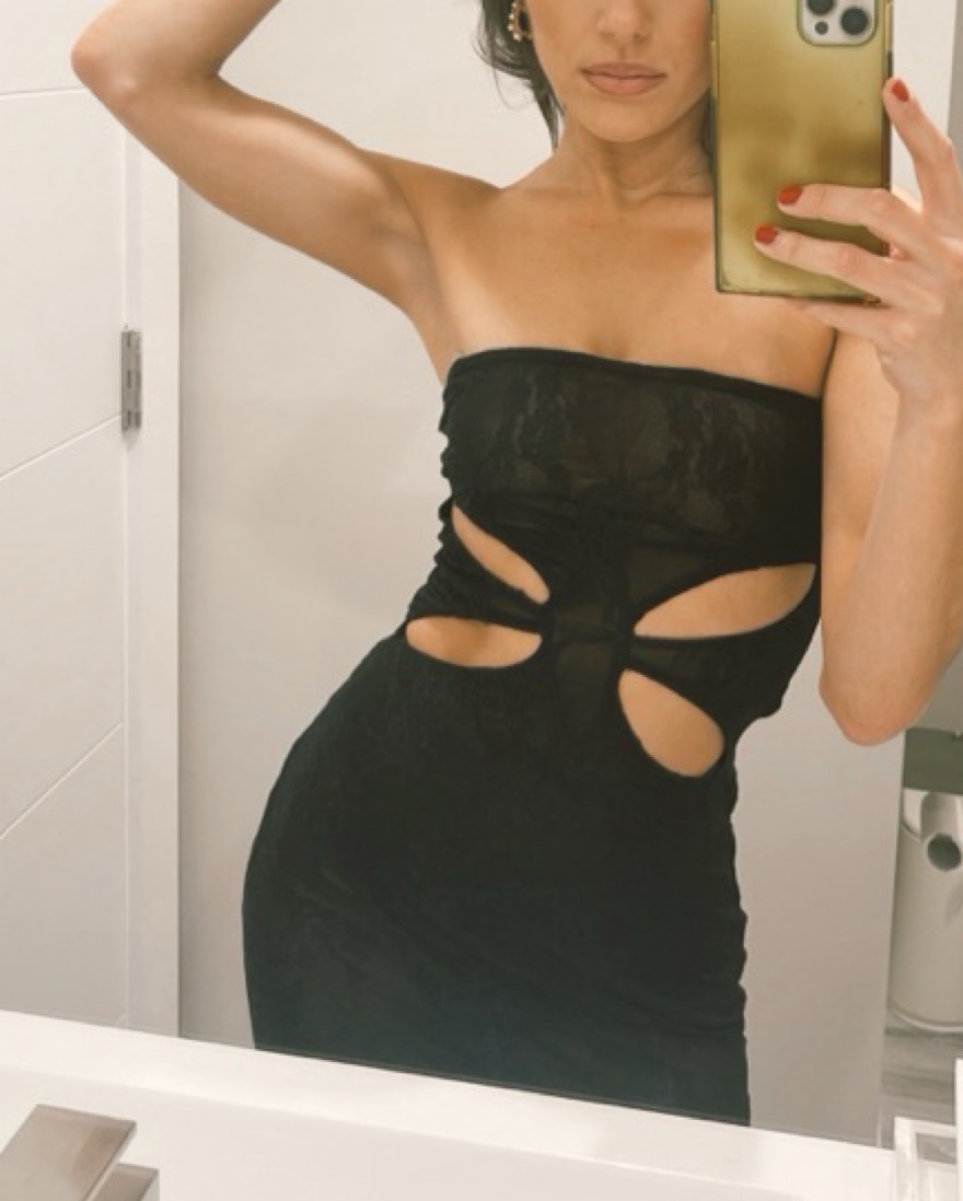 Strapless neckline Front and back diamond cut outs Centre back zip fastening Centre back back split Mesh underlayer Bodycon fit Maxi length