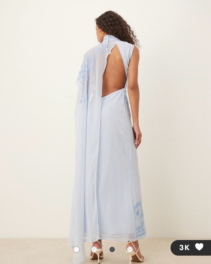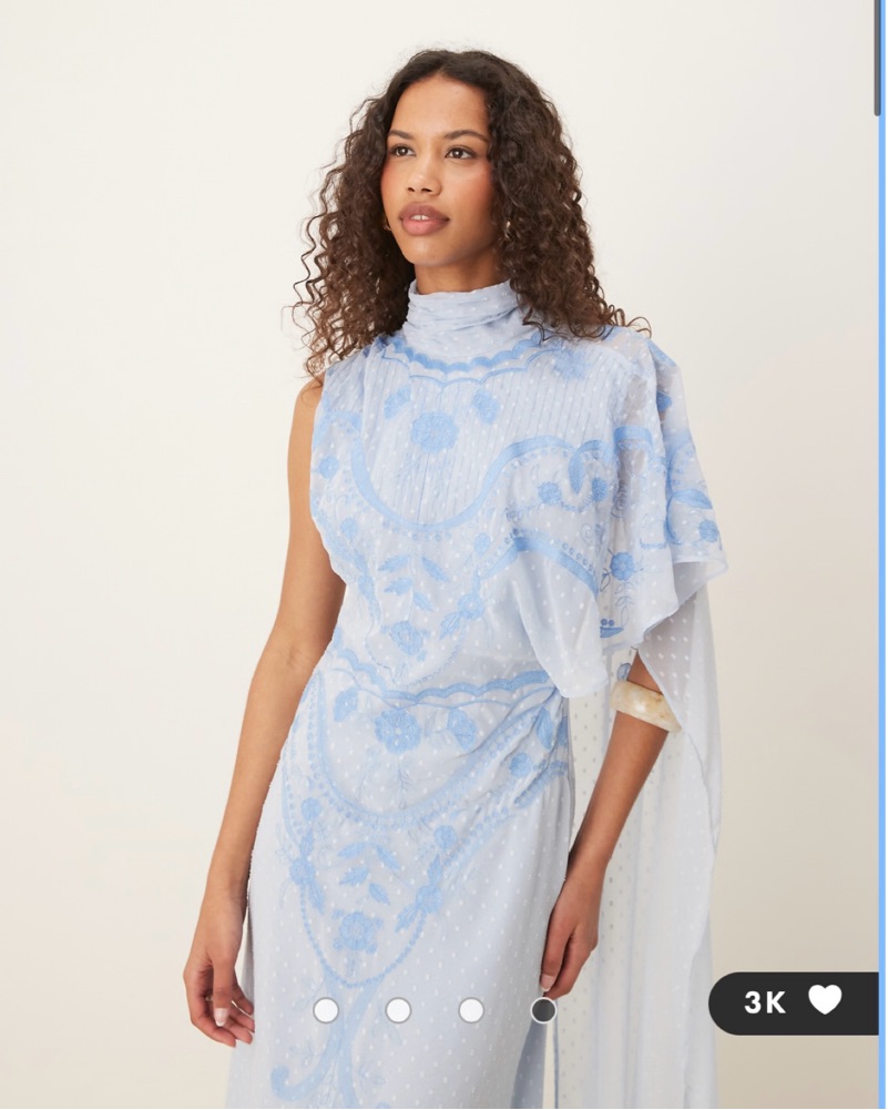 Beautiful embroidered light blue high neck formal dress with cape over one shoulder. Size 0. Perfect for a summer wedding or event!