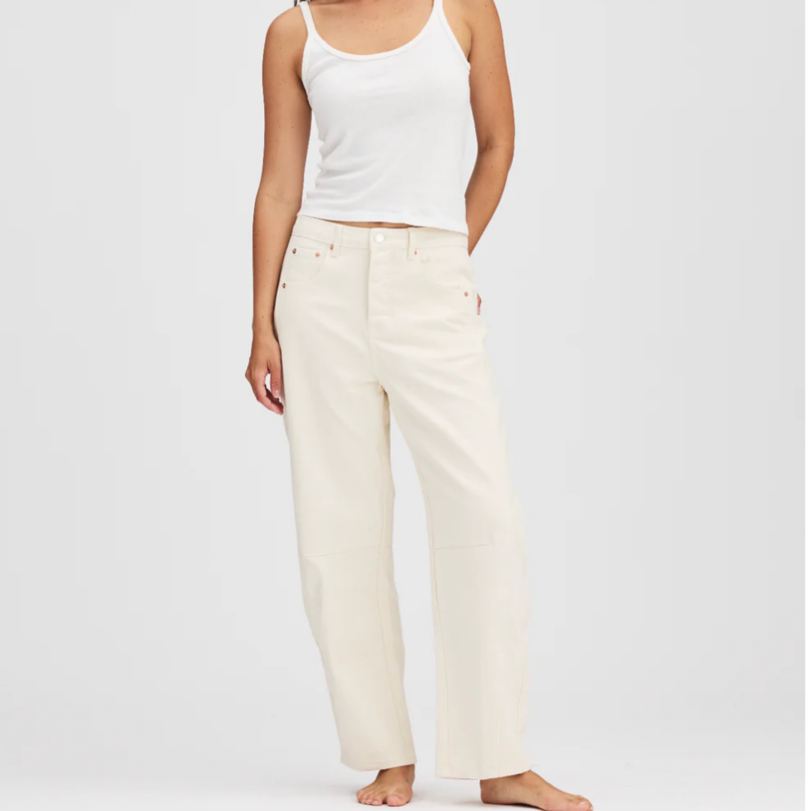 Low waisted jeans with a slightly oversized fit, featuring a barrel leg and tapered bottom. I’m usually a 26 but sized down to a 25 and they still fit a little oversized but such a cute fit.
