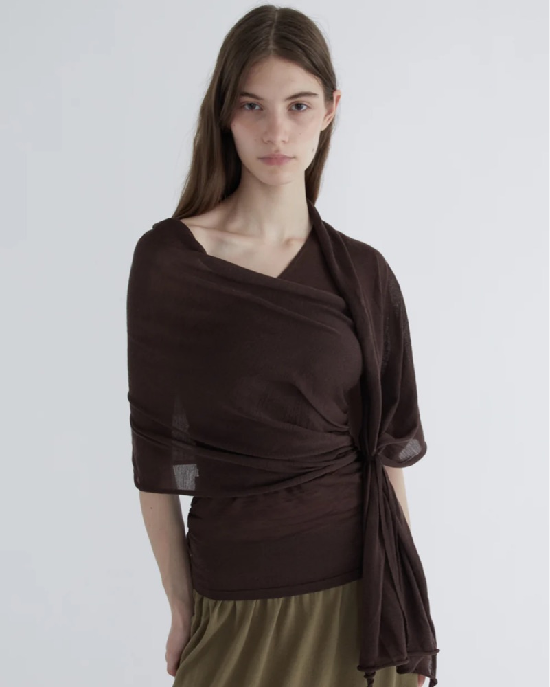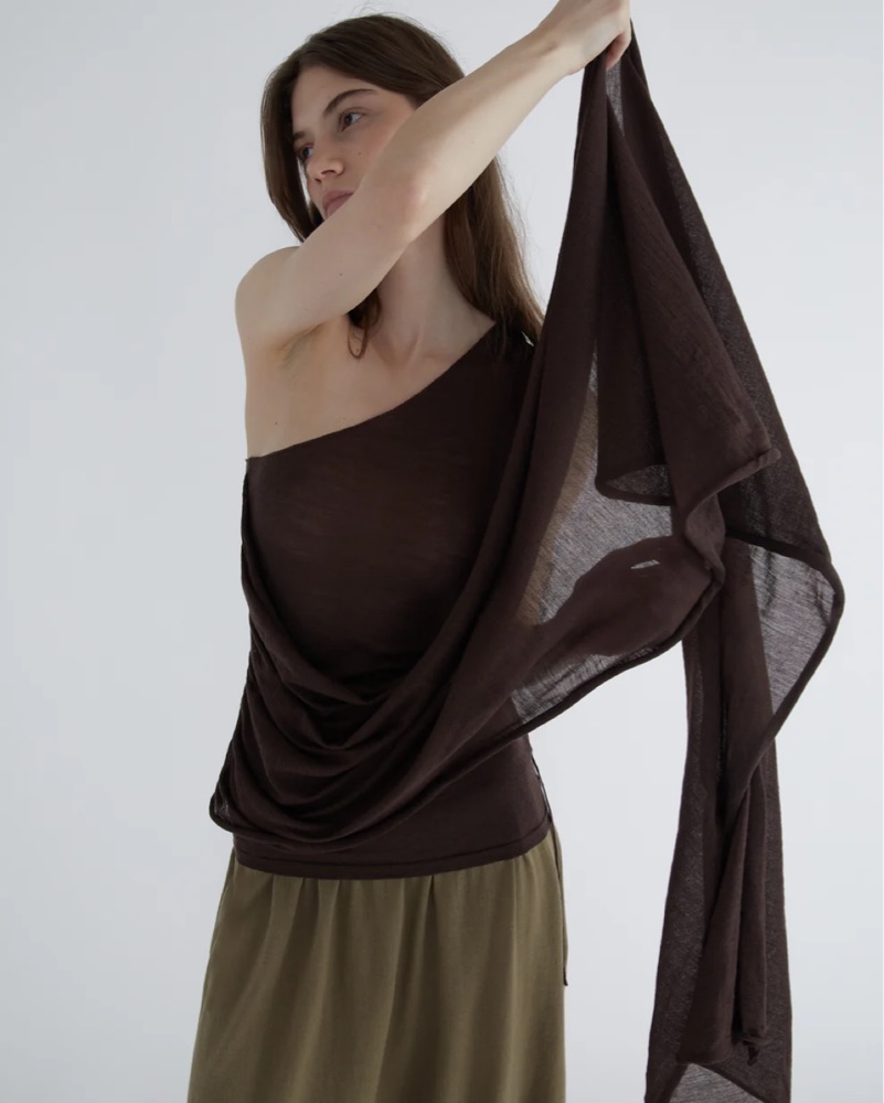 merino wool super lightweight top with attached cape that can be worn multiple ways. Strappy top with a wraparound cape attached at one side, offering multiple styling options. Made from warm, lightweight fabric.