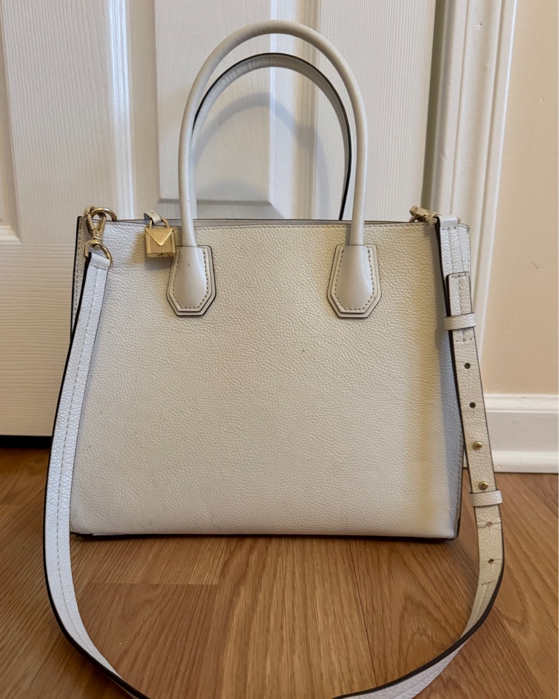 White with gold-tone hardware. Features top handles + a removable crossbody strap, multiple interior compartments with a zip pocket for easy organization, and signature MK lock detail. Gently used with minor signs of wear including a small mark on the front.