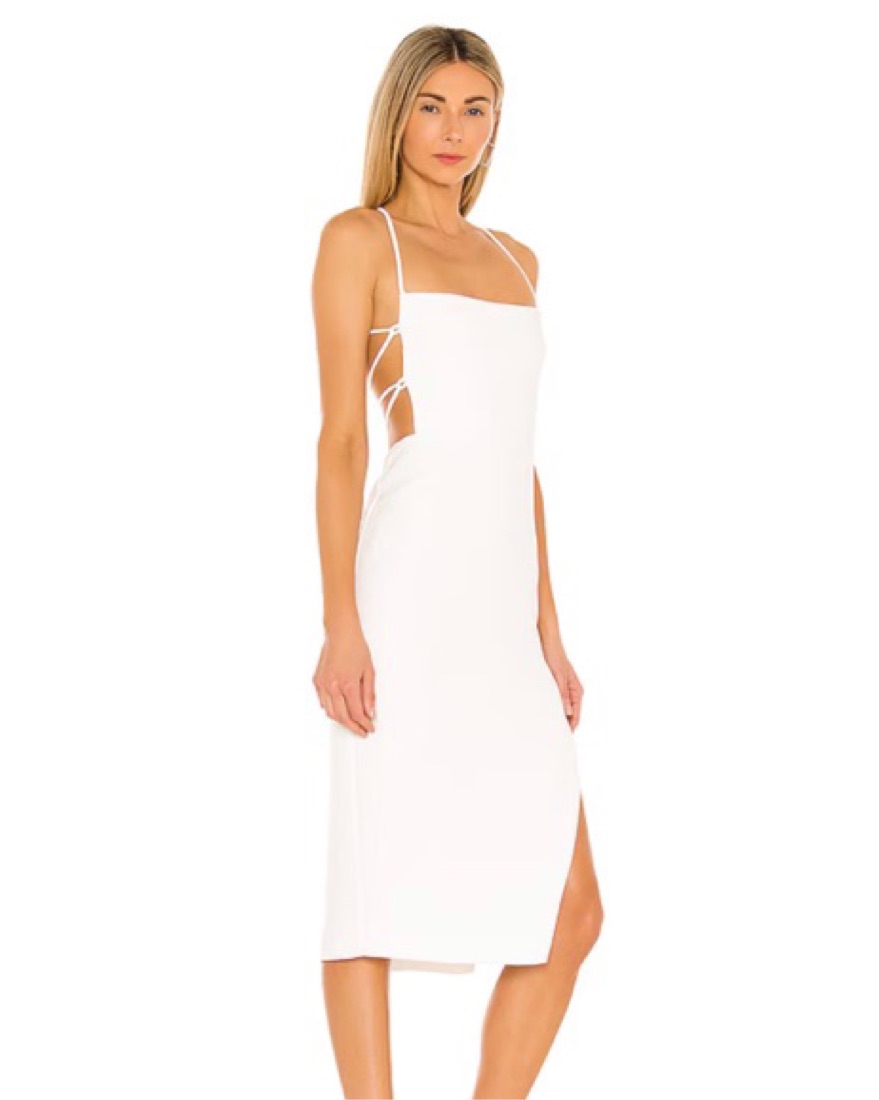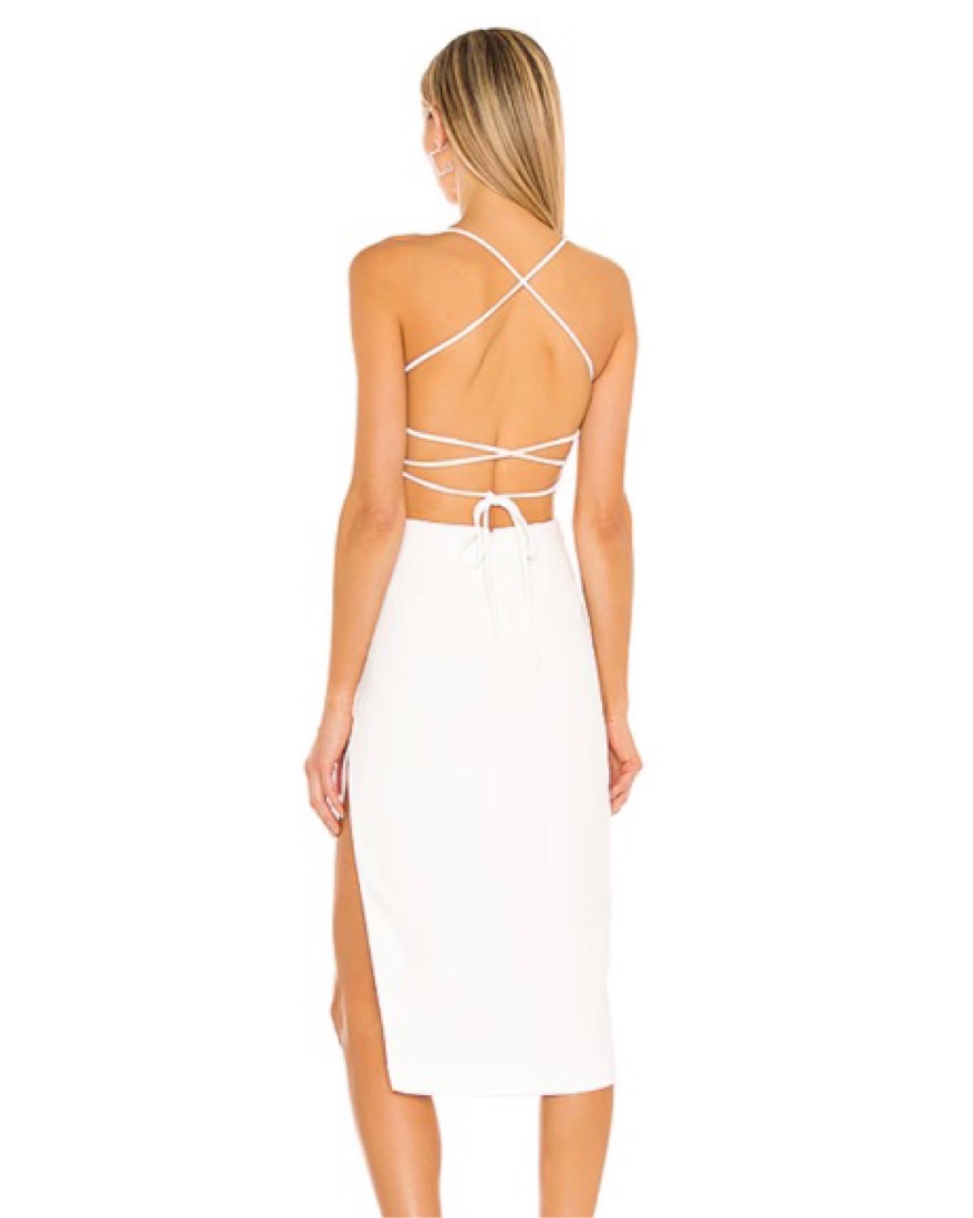 White NBD brand midi dress from Revolve. Lace up back, slit leg detail. Perfect for graduation/summer white parties. Size M, adjustable tie back straps.