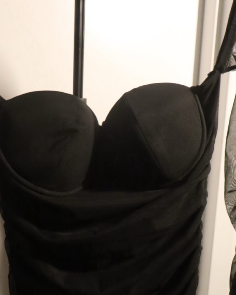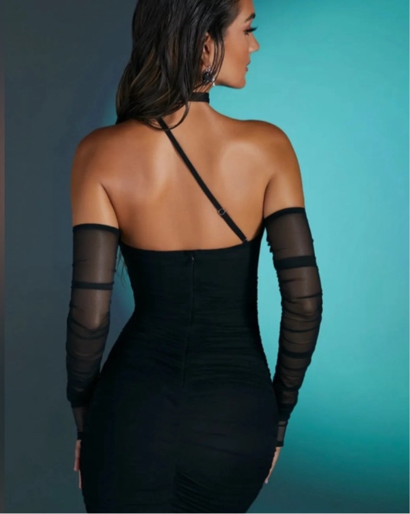 This stylish black mini dress is perfect for a night out on the town. The off-the-shoulder design and ruched details create a flattering silhouette.