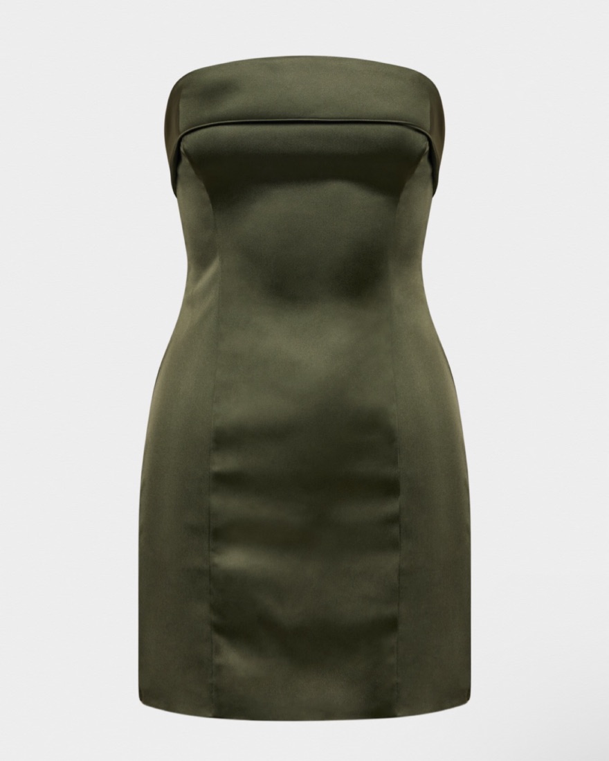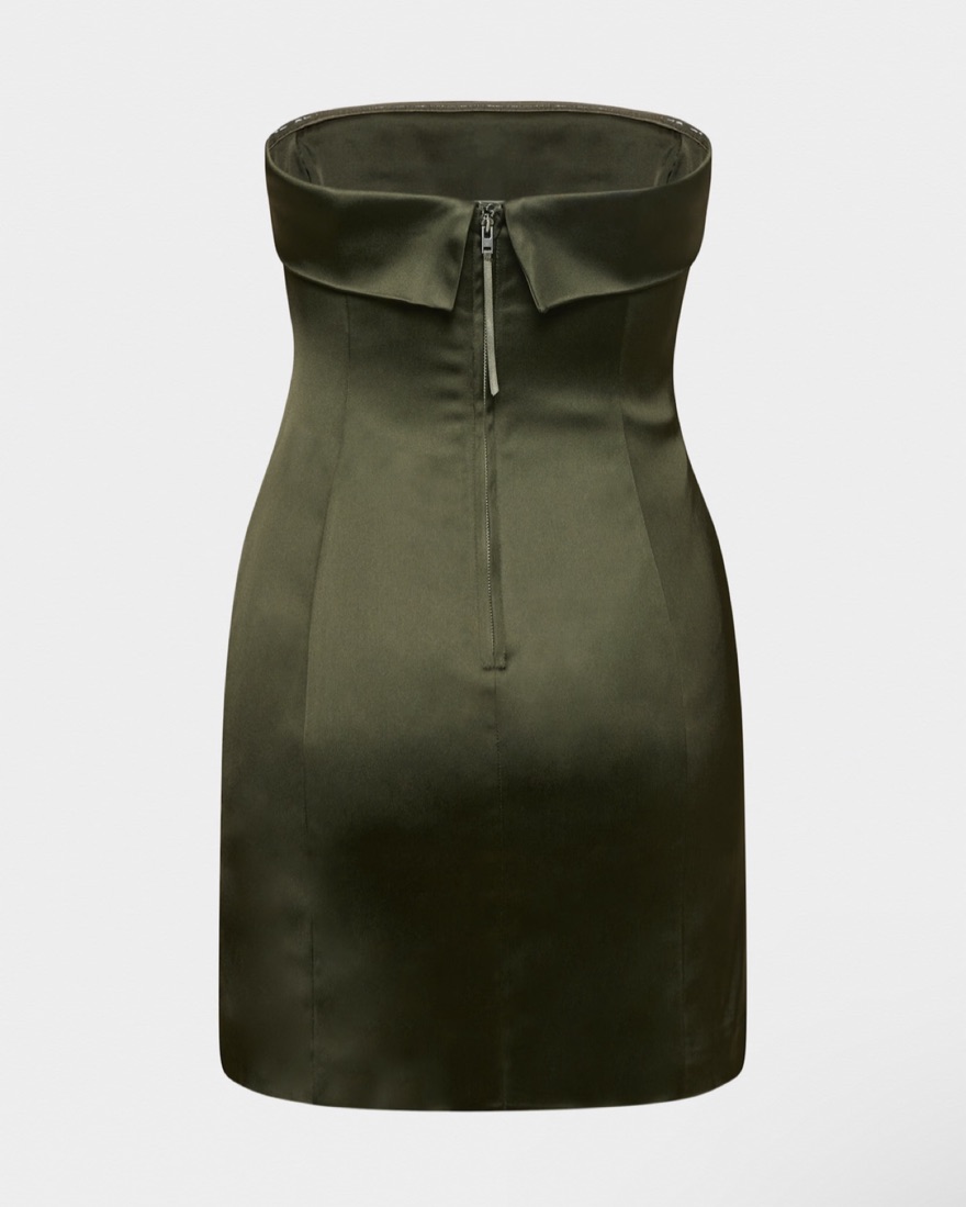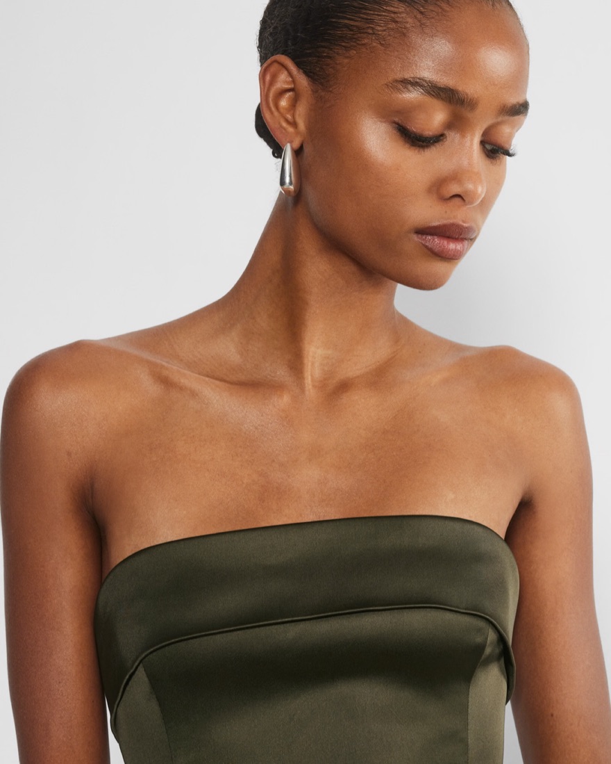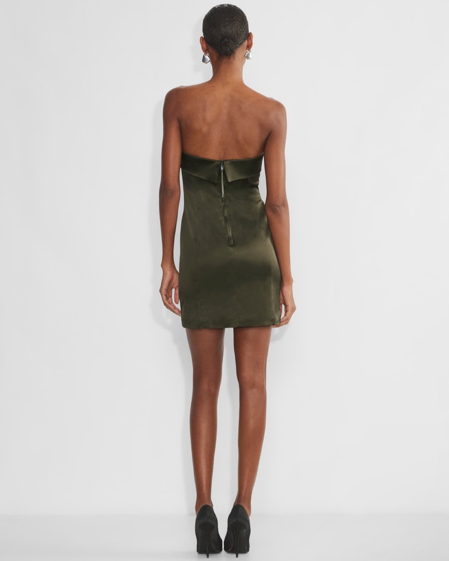 Lined strapless mini dress with princess seams for shaping. It’s cut from sleek satin with a soft sheen and smooth feel. Fits true to size. Close fit that hugs the body