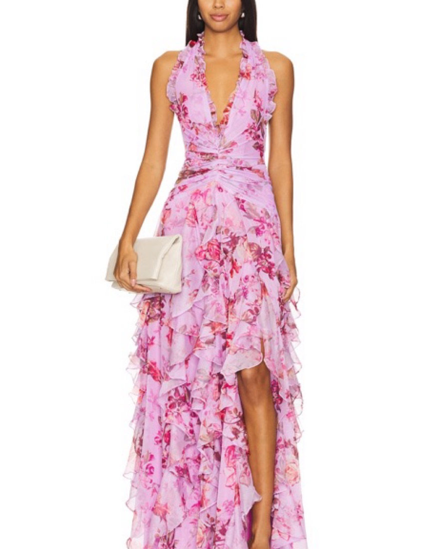 Low back halter neck evening gown. PATBO. Perfect for a wedding guest. Style it with silver heels and a matching bag.
