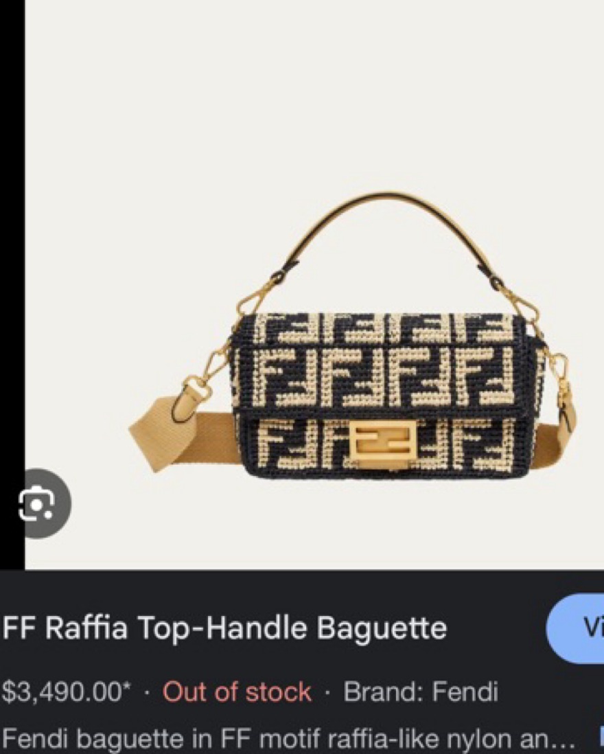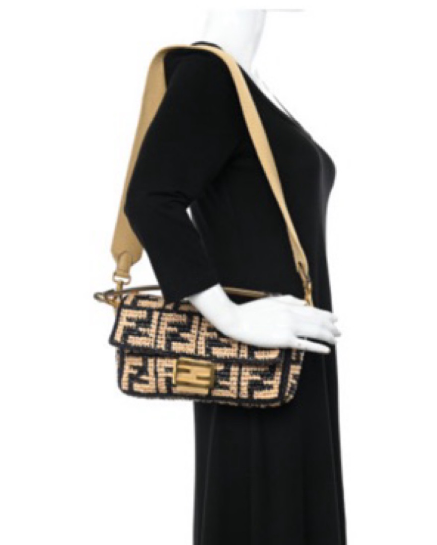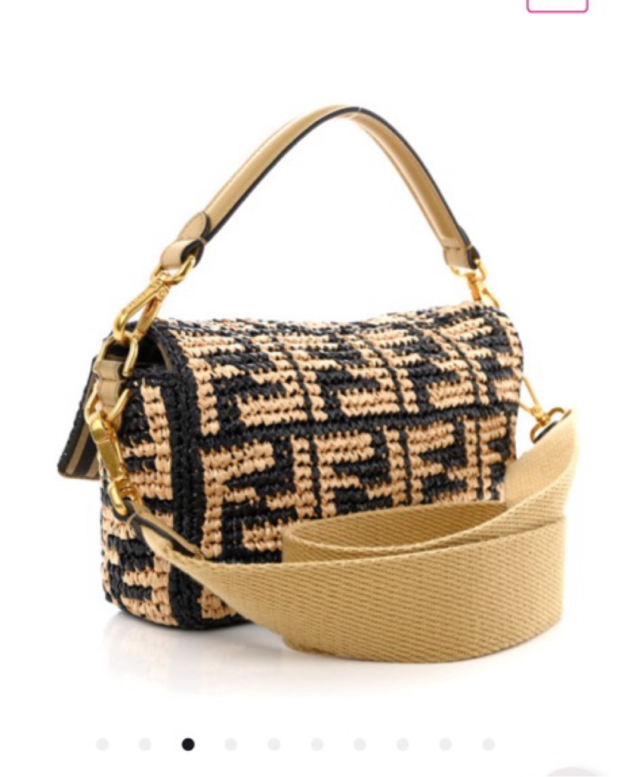 Fendi baguette in raffia woven beige and black. Top handle as well as detachable long strap perfect vacation/holiday bag.