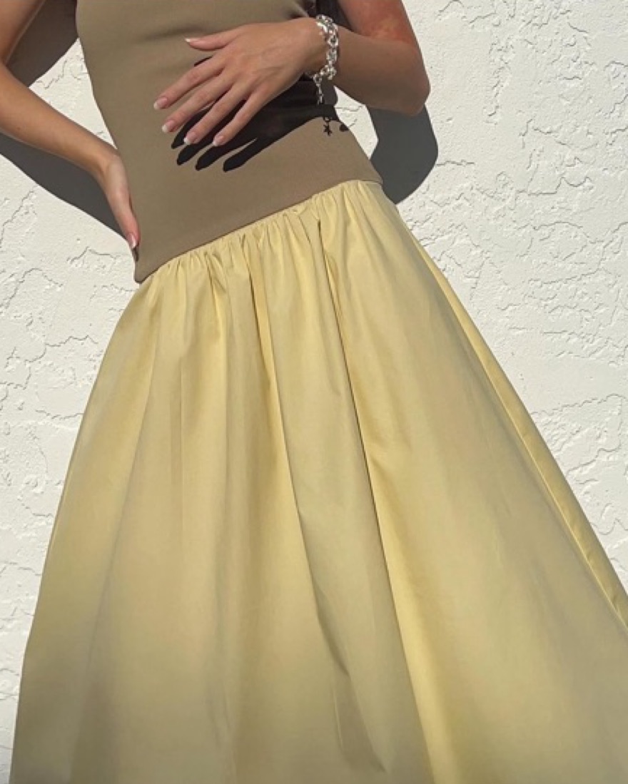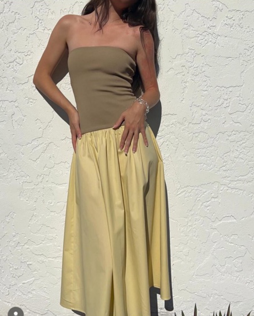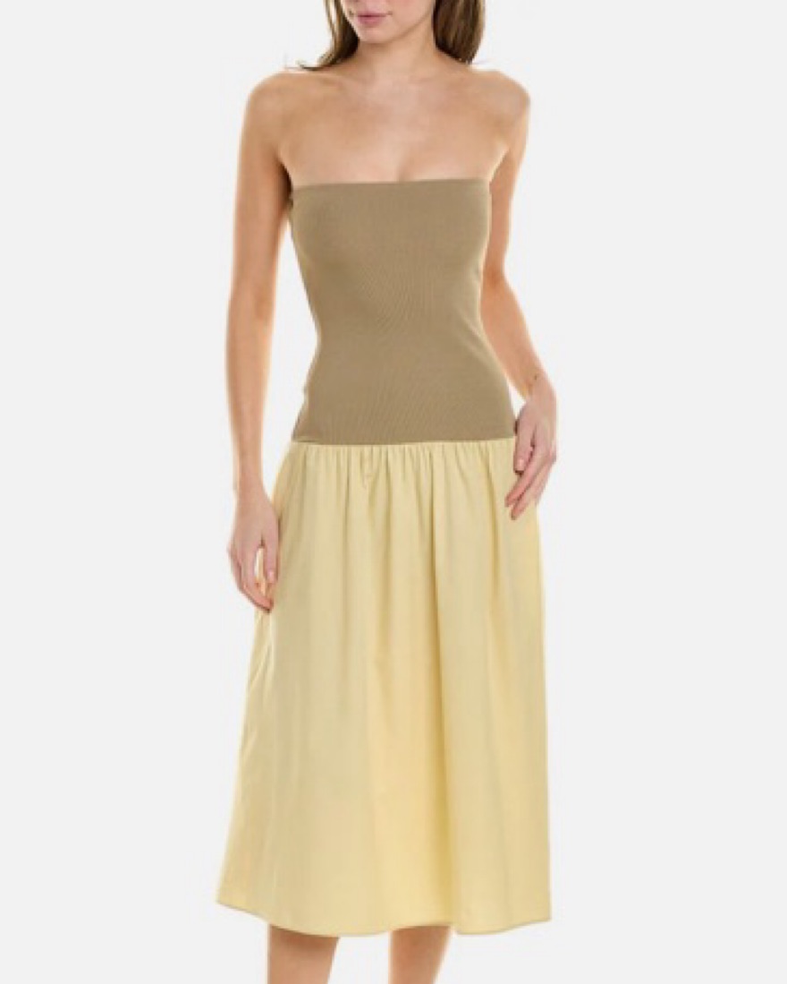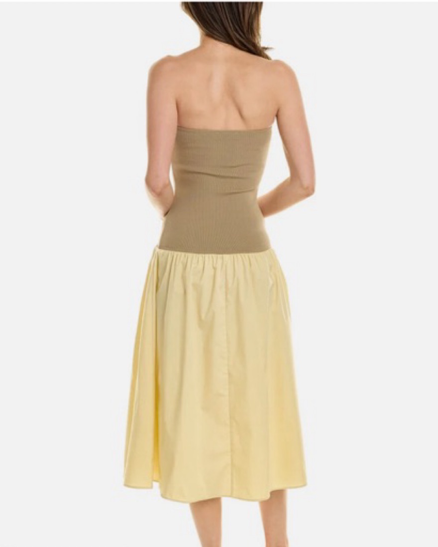 WeWoreWhat Ribbed Midi Dress in size XXS, a stylish and versatile addition to your wardrobe. This dress features a flattering strapless neckline, ribbed bodice, shirred waist, and a poplin skirt in a beautiful oat/wheat color. With a length of approximately 41” from shoulder to hem