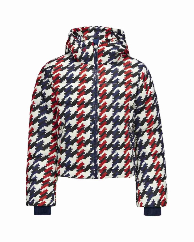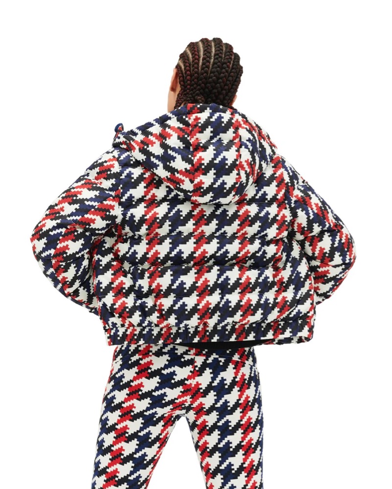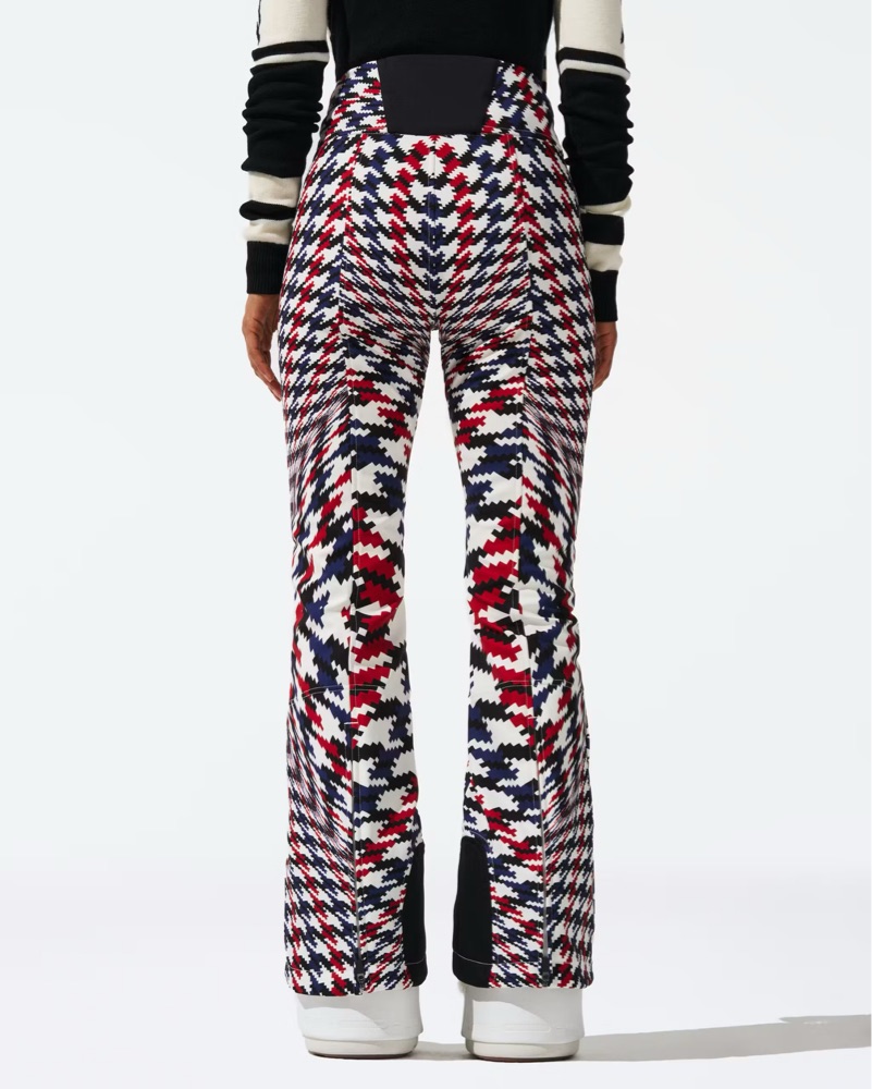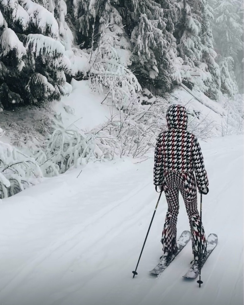 This bold houndstooth print ski outfit is perfect for hitting the slopes in style. The vibrant pattern and form-fitting silhouette are both eye-catching and functional for an active day on the mountain. You can also rent separately needed just chat me!