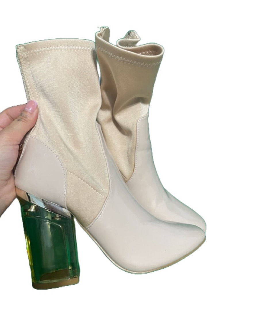 Beige ankle boot w/ clear heel. Heel has a yellowish tint.