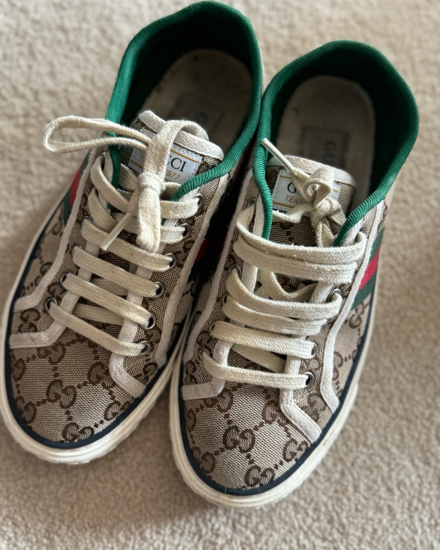 One of the Hottest selling items at Bloomingdale’s saks and Nordstrom right now. Excellent pair of Gucci sneakers meant to go with any outfit. Worn condition but still very good condition (actually the worn condition is best in my opinion because they are more comfortable than brand new condition)