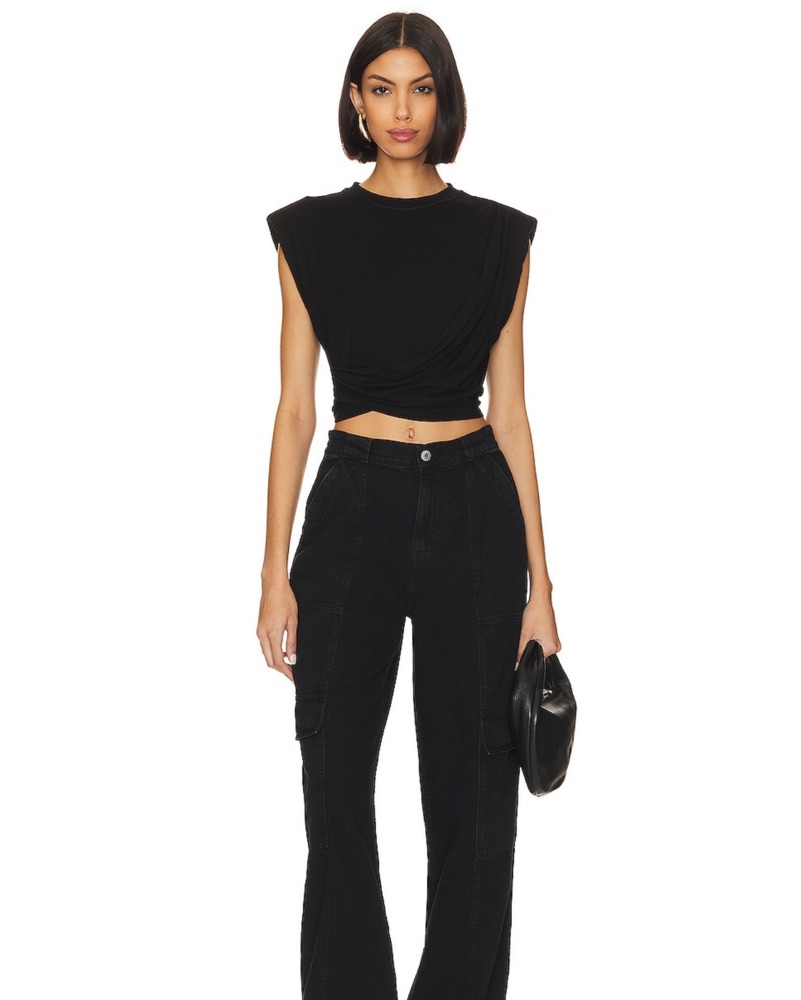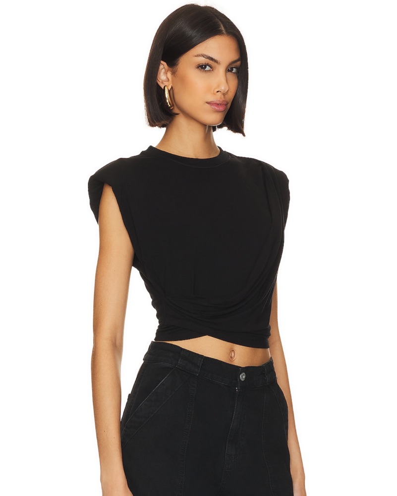 Black crop top with front draping and shoulder pads.