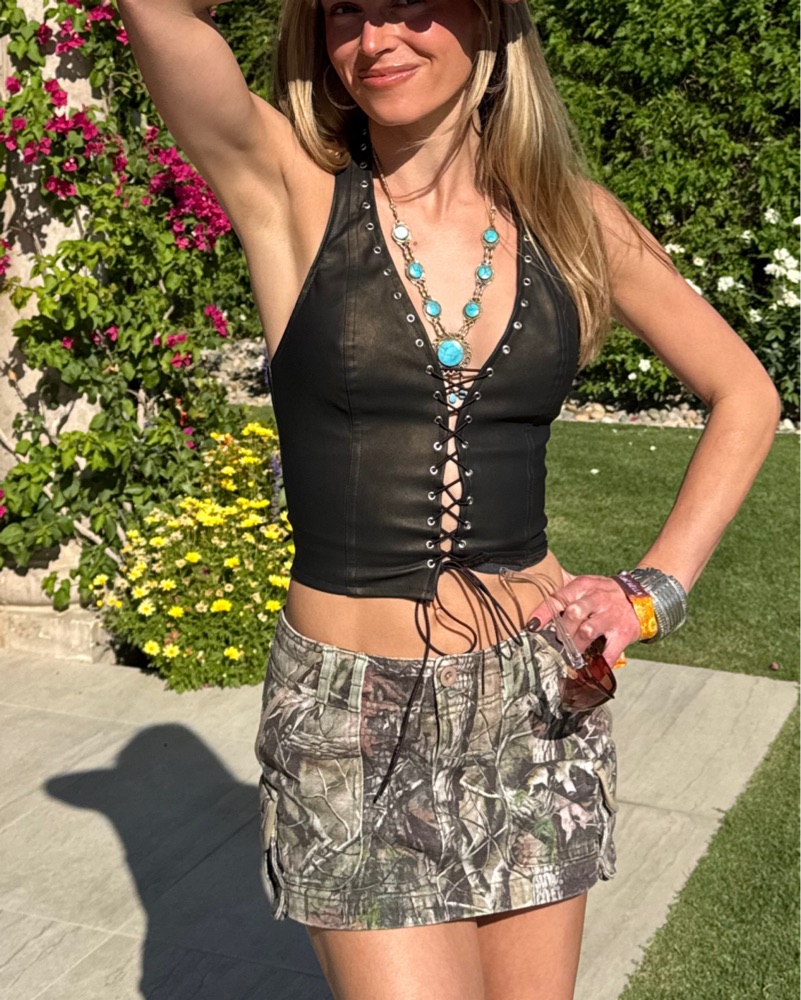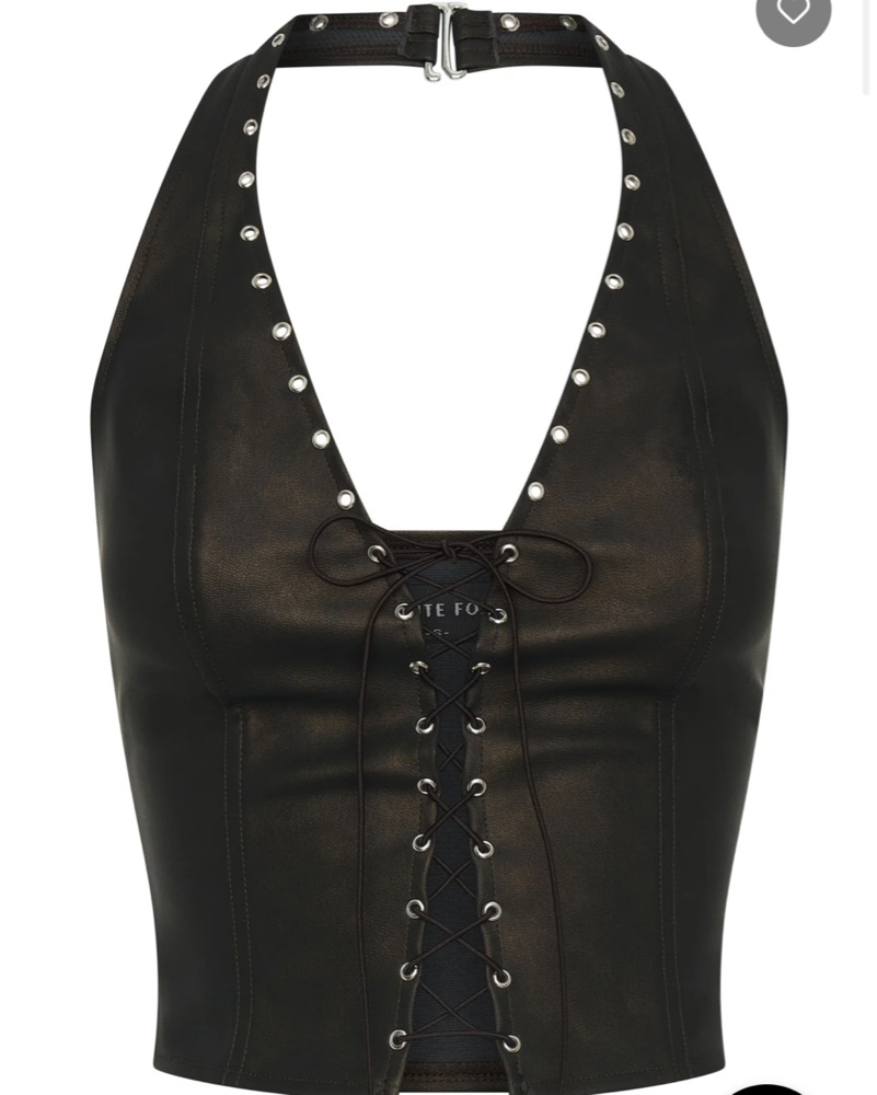 This daring lace-up halter top exudes a bold, rock-inspired look. Pair it with sleek shorts or a mini skirt for a night out on the town.