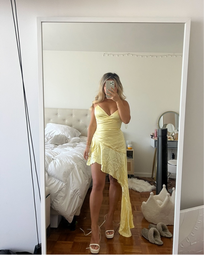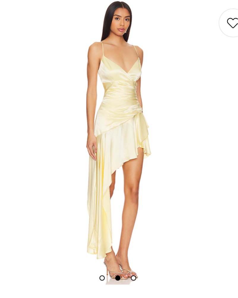 Hidden back zipper closure Ruffle fabric overlay at side Lightweight satin fabric
