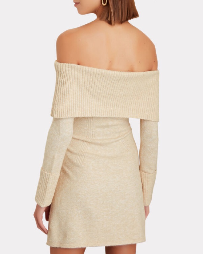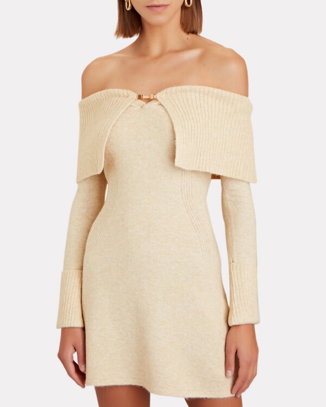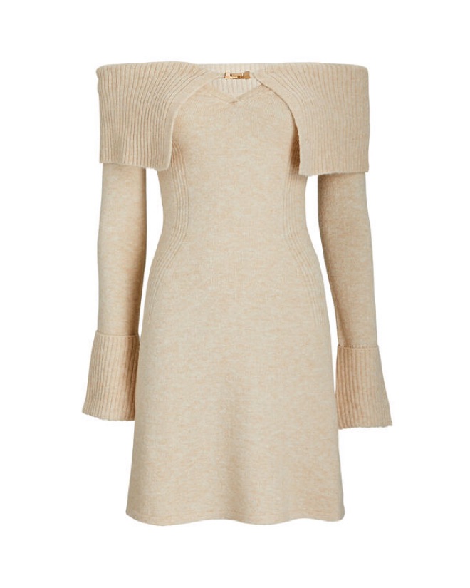 Cult Gaia off shoulder longe sleeve knit mini dress in cream/beige. Perfect for winter to dress up or down. Apres ski