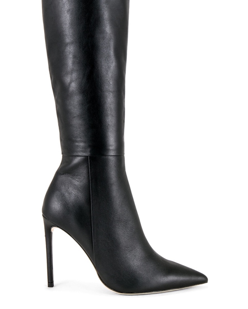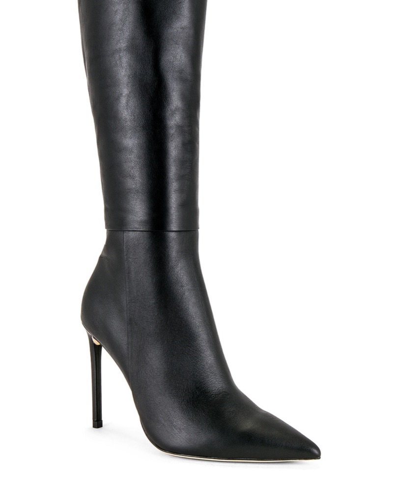 These sophisticated knee-high stilleto boots are perfect for elevating any outfit. Pair them with a midi dress or skirt for a chic, night-out look.