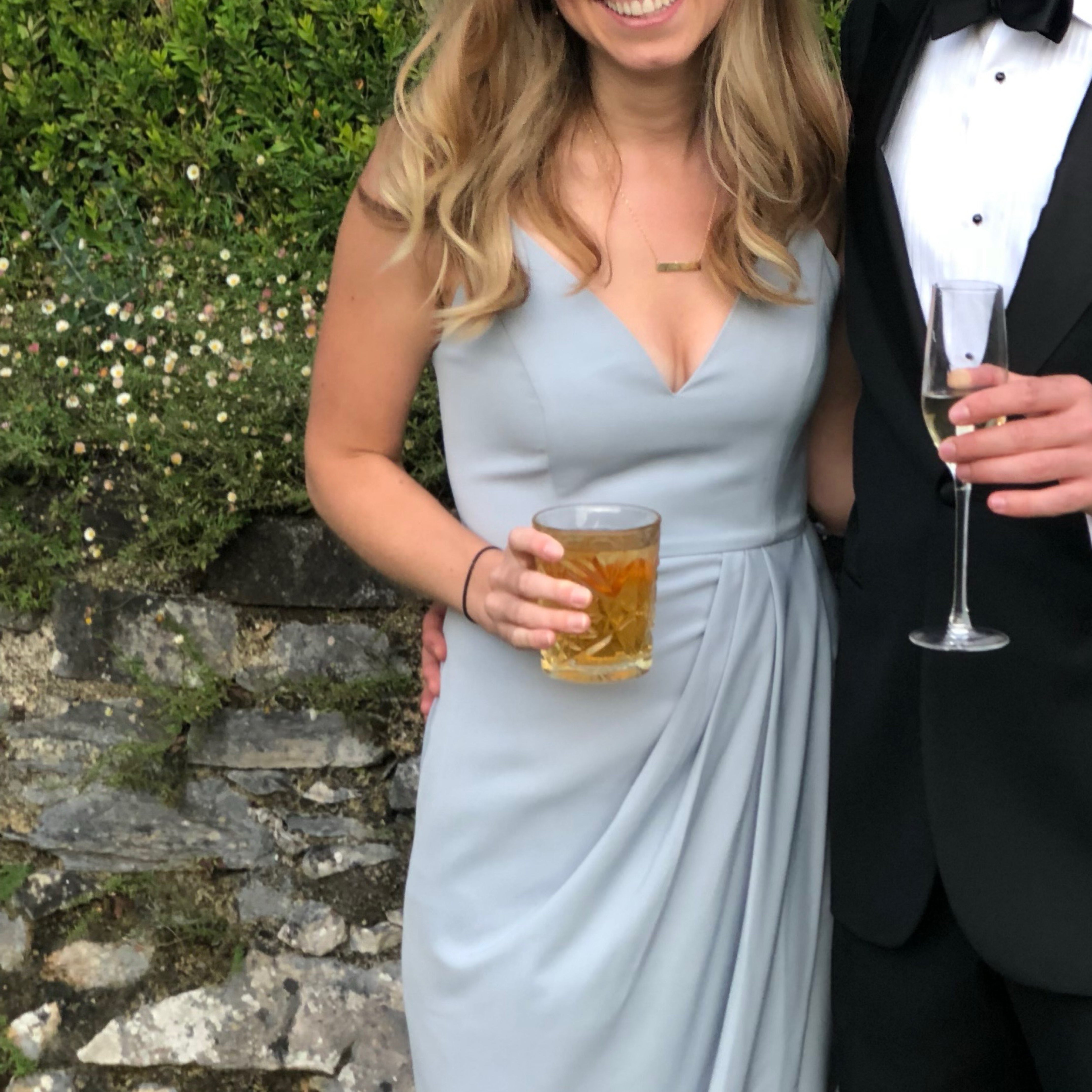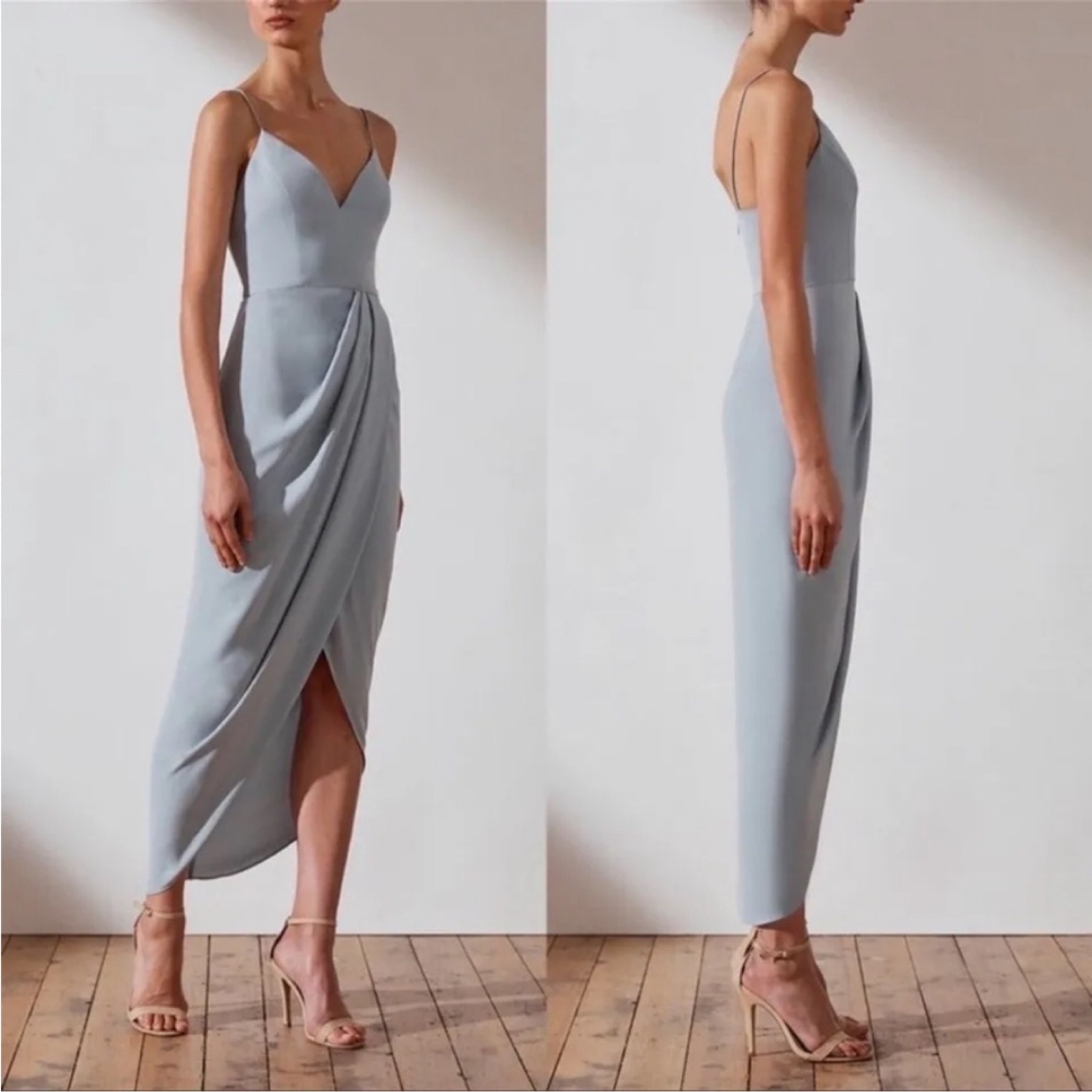 Powder Blue, lightweight high end silk midi (or passing for long if you’re 5’4”). Black tie approved but versatile enough for cocktail and formal. Worn once, so comfortable