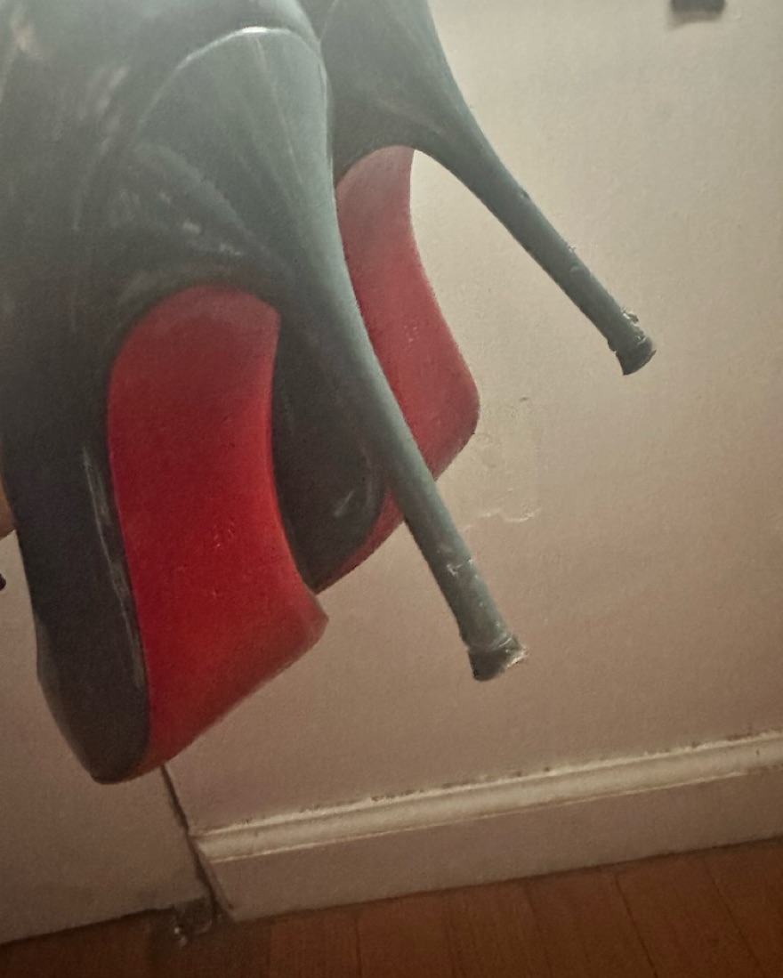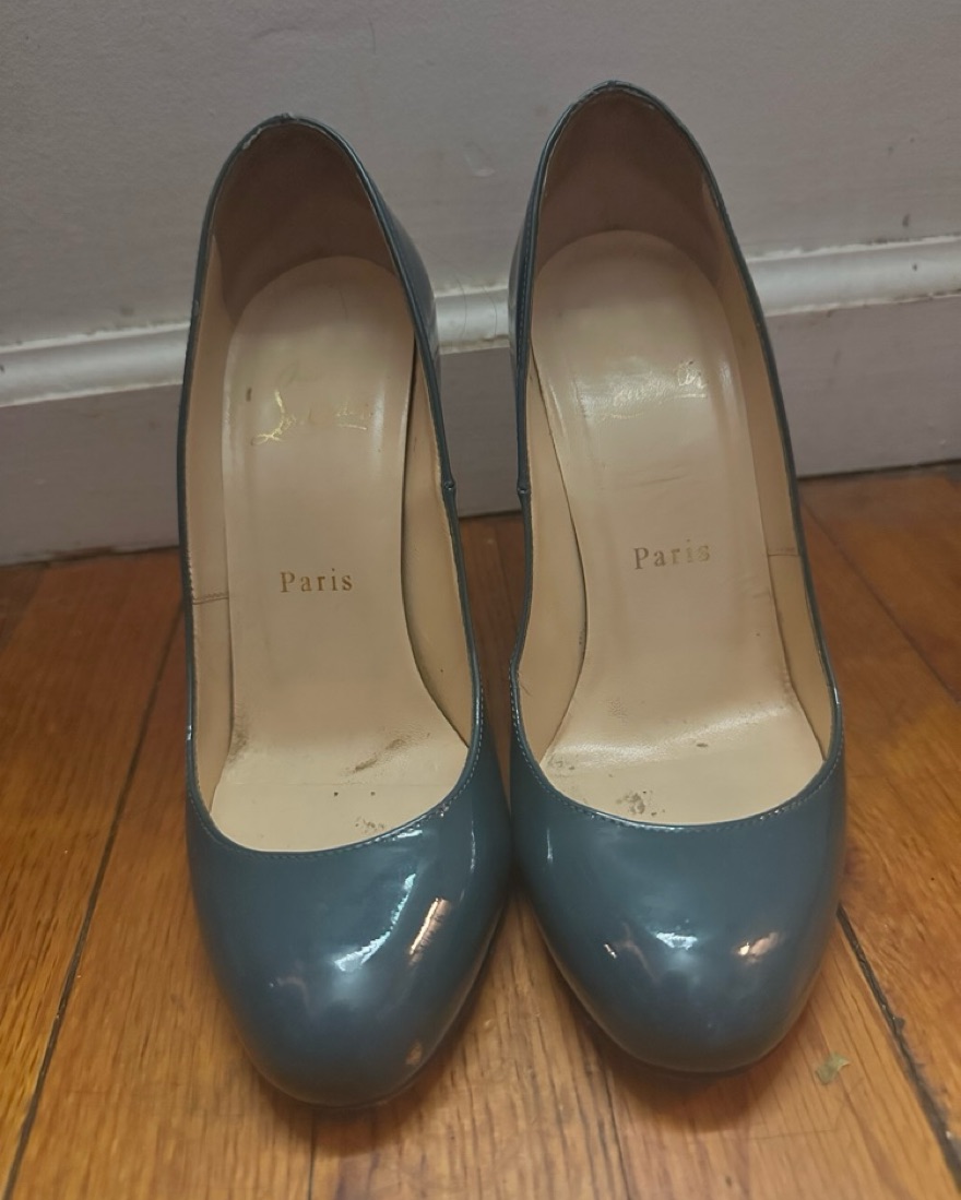 blue Louboutin pumps. scuffing along backs of heels. size 36.