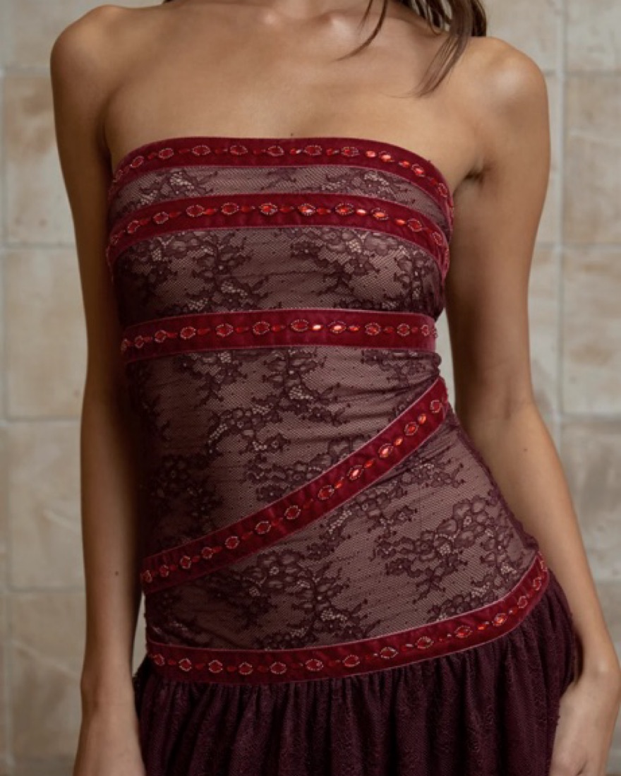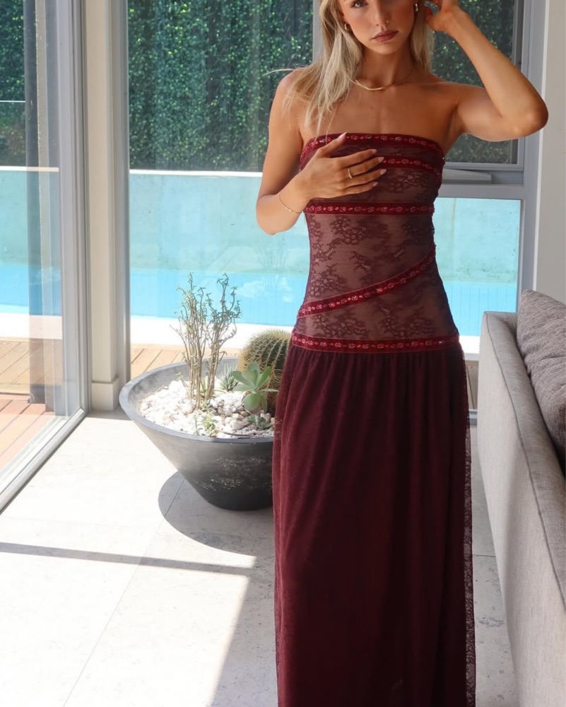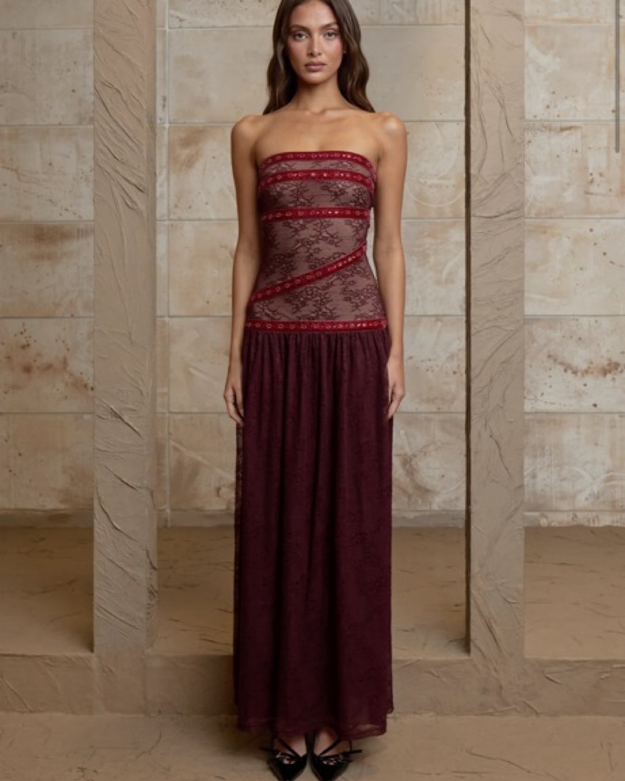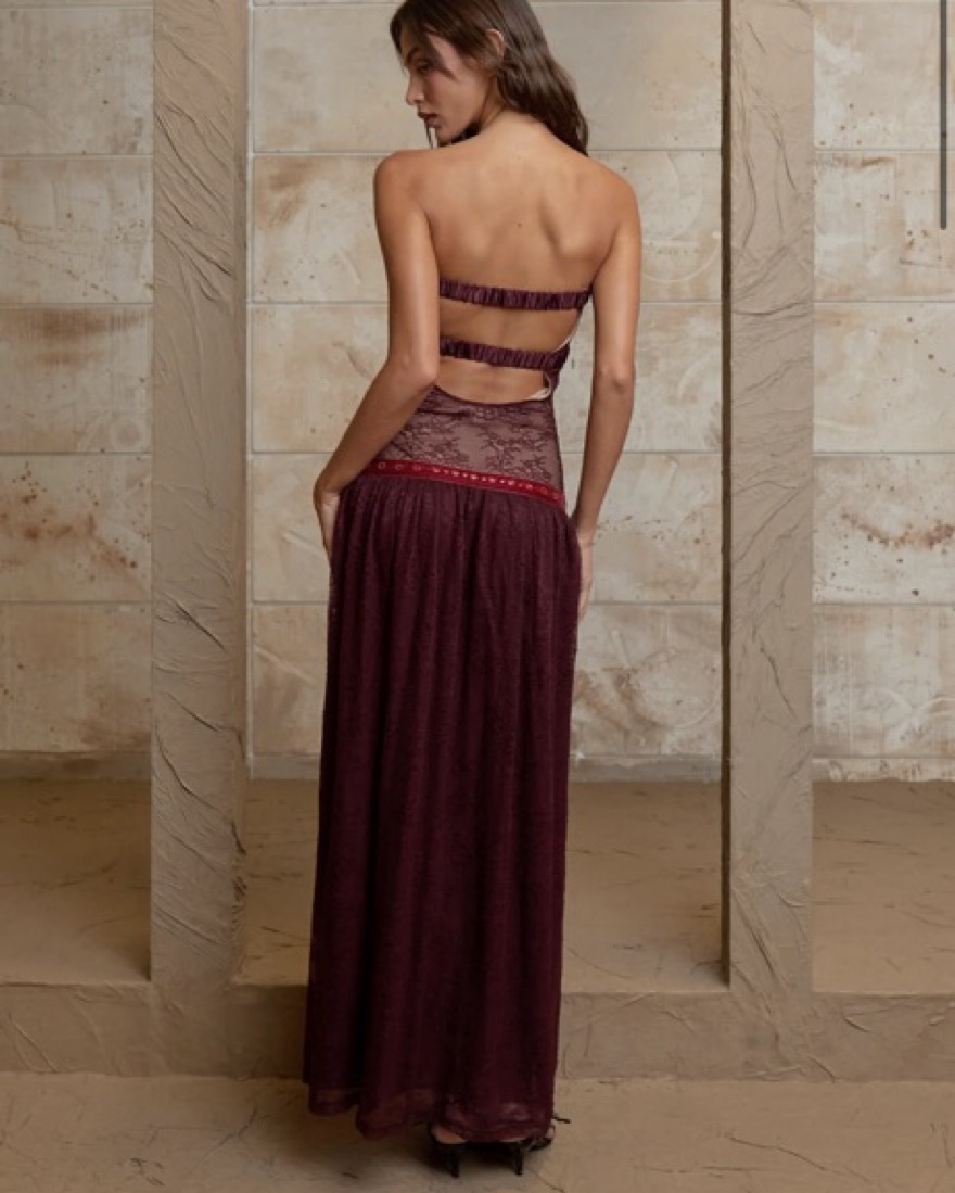 beautiful lace wine red / burgundy long dress from fait par foutch. XS.