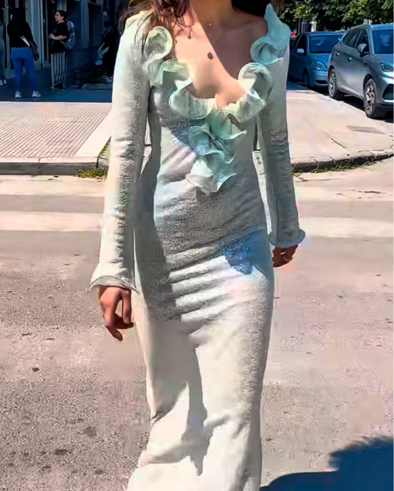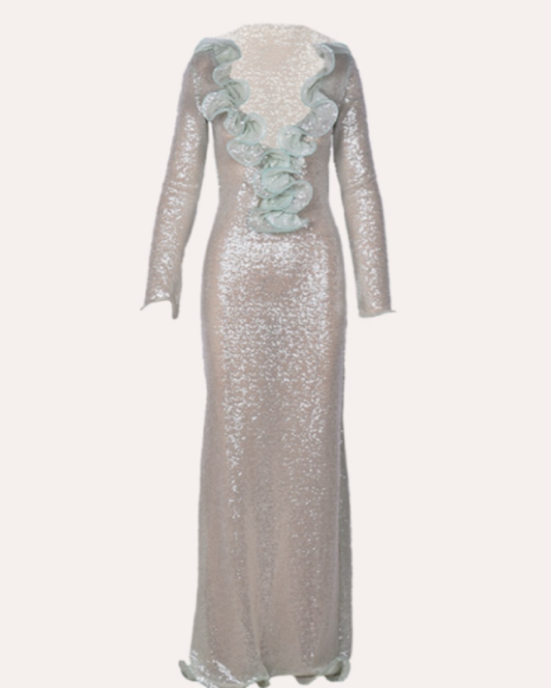This stunning maxi dress is perfect for a glamorous evening event. The shimmering sequin fabric and ruffled detail create a show-stopping look.