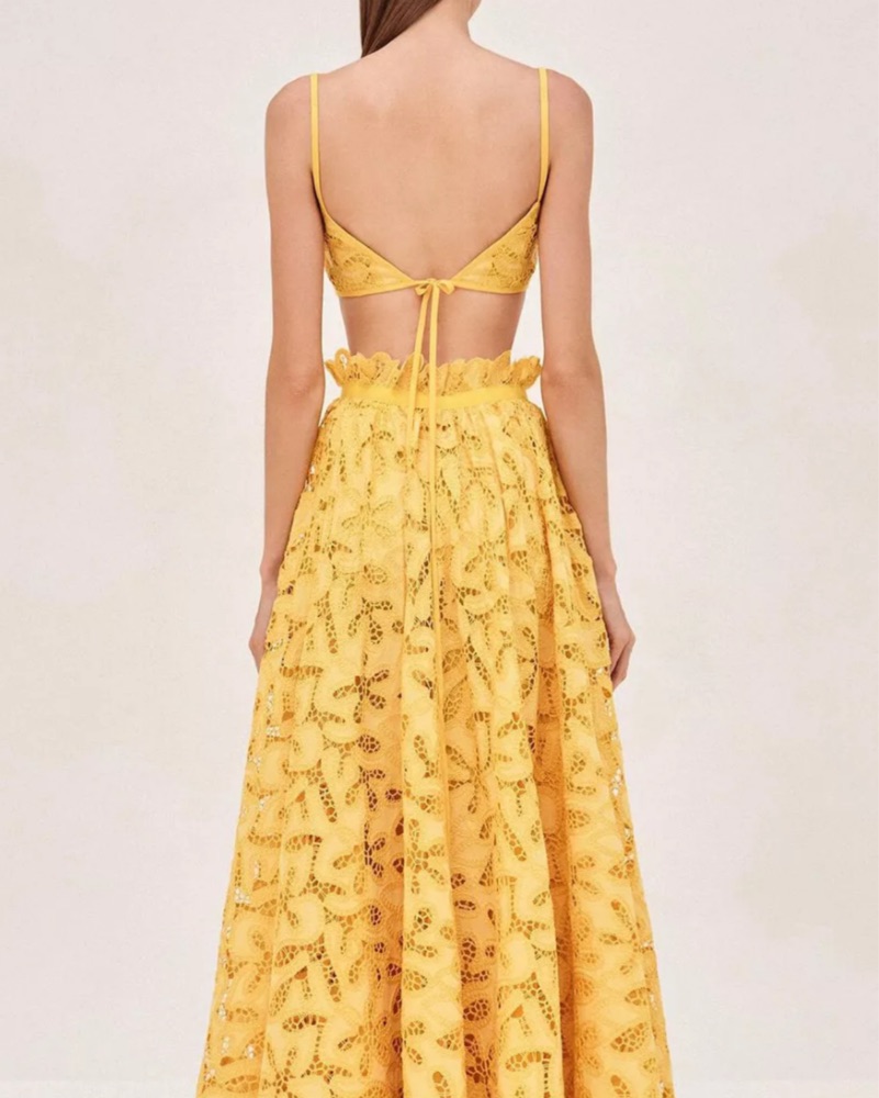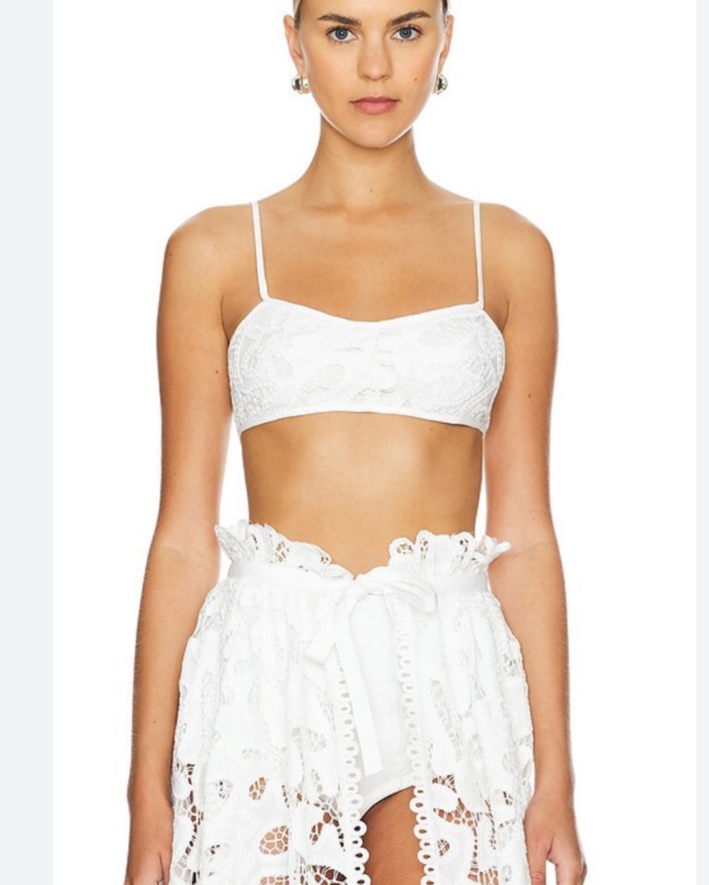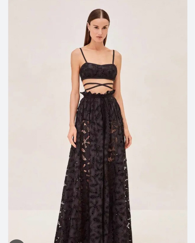 A gorgeous lacey bralette that pairs perfectly with the lace broderie Dilara skirt, also available. Features adjustable tie back that can even wrap around for a modern sexy look. Never worn. *other colors are shown simply to show detail, this top is in black!*